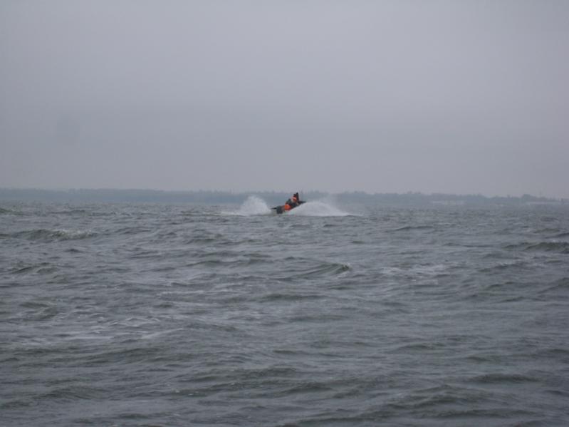 !Вперёд!Но отойдя с километр,понимаем - вчера это было так,слегка качало!Волна уже под пол-метра...Чем дальше,тем хуже.В тумане с трудом находим команду ГОООЛСН - 1,у которых приблизительно рядом с нашей точкой своя.Начали.А рыба опять ни бирот.Да ещё проводку хоть как-то контролировать возможно только при забросе по ветру или против.Обловили точку,и надо бы как-то её сменить,но как это сделать в плотнейшем тумане без ЖэПээС.Включаю визуальную память,и ориентируясь по нашему положению относительно направления волн,ТАКИ ПРИХОЖУ НА ТОЧКУ!!!:oНо и там голяк,лишь через пол-часа два жёстких судачьих удара у подножья горы,причём на одной проводке,и всё...Кстати,из этих двух поклёвок я сразу сделал вывод - нашли стаю судака,но он неактивен.Что,кстати,было понятно и после финиша - судака не наловил никто!Короче,после горок решено было проверить 9-10 метровые ровные поля.И это по итогу позволило не улететь совсем - из нескольких поклёвок реализовали одну,но хоть это...Ну а затем,как я уже писал в предыдущем посте,налетел реальный шквал,и за пятнадцать минут до финиша,дабы не рисковать жизнью и здоровьем команды и судьи из команды Мир Рыболова (кстати,когда шквал налетел,Сергей сказал : "Лучше буду смотреть в сторону,но только не на волны!"),я принял решение сниматься с якорей,и любым путём добраться до пляжа,и прикрывшись берегом,идти к лагерю.Старый анекдот в тему.Любой десантник к дембелю становится очень накачанным,и на вылете из люка самолёта способен задницей перекусить лом.Так вот,после финиша наша команда с лёгкостью уделает любого десантника!Вот такими нелёгкими и поучительными вышли соревнования на Кубок РБ!