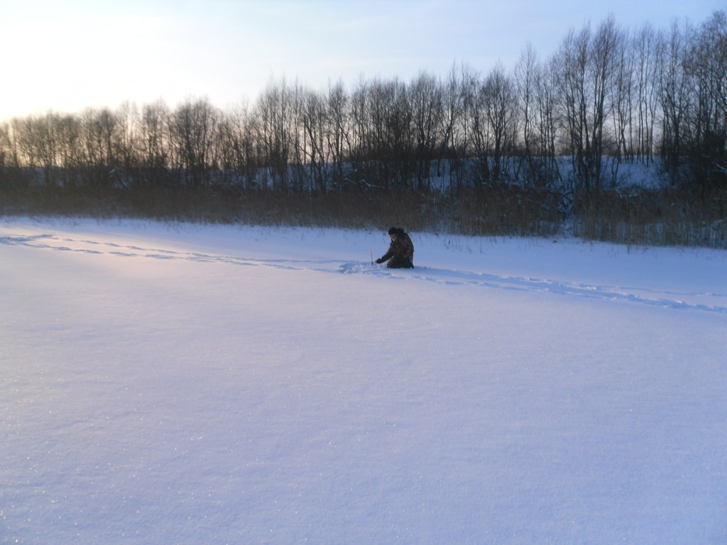 на льду были рыбаки но, они все ловили в доль берега, мы конечно удивились, неужели все ловят мотросиков!? Но отправились на те места где были года 4 назад летом, тогда плотва ловилась как с пулемета, по 18-30 секунд рыбка, да какая от 100 до 200 гр. плотва так плотва... выбрали место к середине озера насверлили лунок одни кормиллись а мы пошли выставлять ставки, их быдо 30, но живцов только 9, кинул нас мужичек насчет живца, вечером накануне рыбалки, и купить уже потом не успели. но да ладно будем в плотву лучше упираться...:)