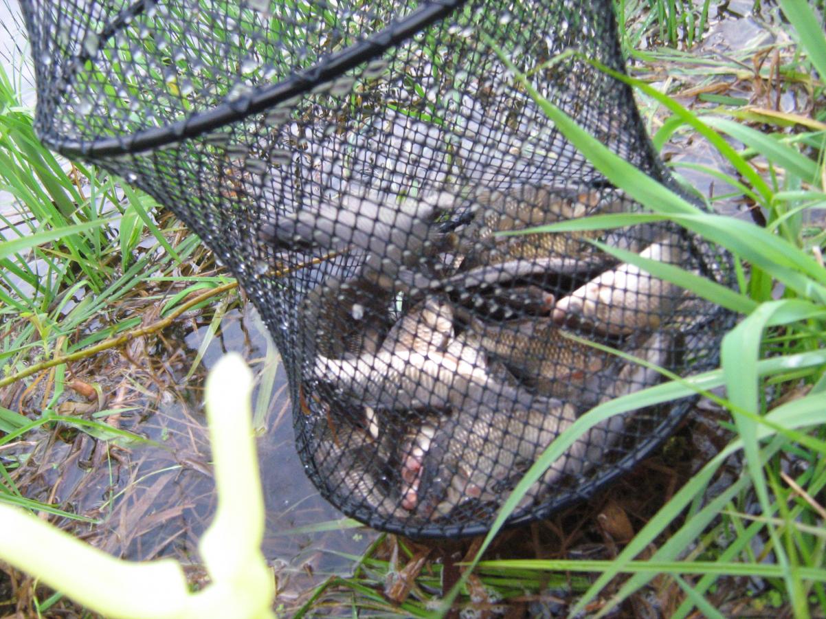 Благо на помощь пришел Валера-кот со своей "кошкой" ;). Зацепив сетку, мы вдвоём чуть стронули её (она была растянута между 2 колами, воткнутыми в грунт). Длина метров тридцать. Фотку Валера выложит. На сетке желтела моя джига. Браконьер нам не друг!