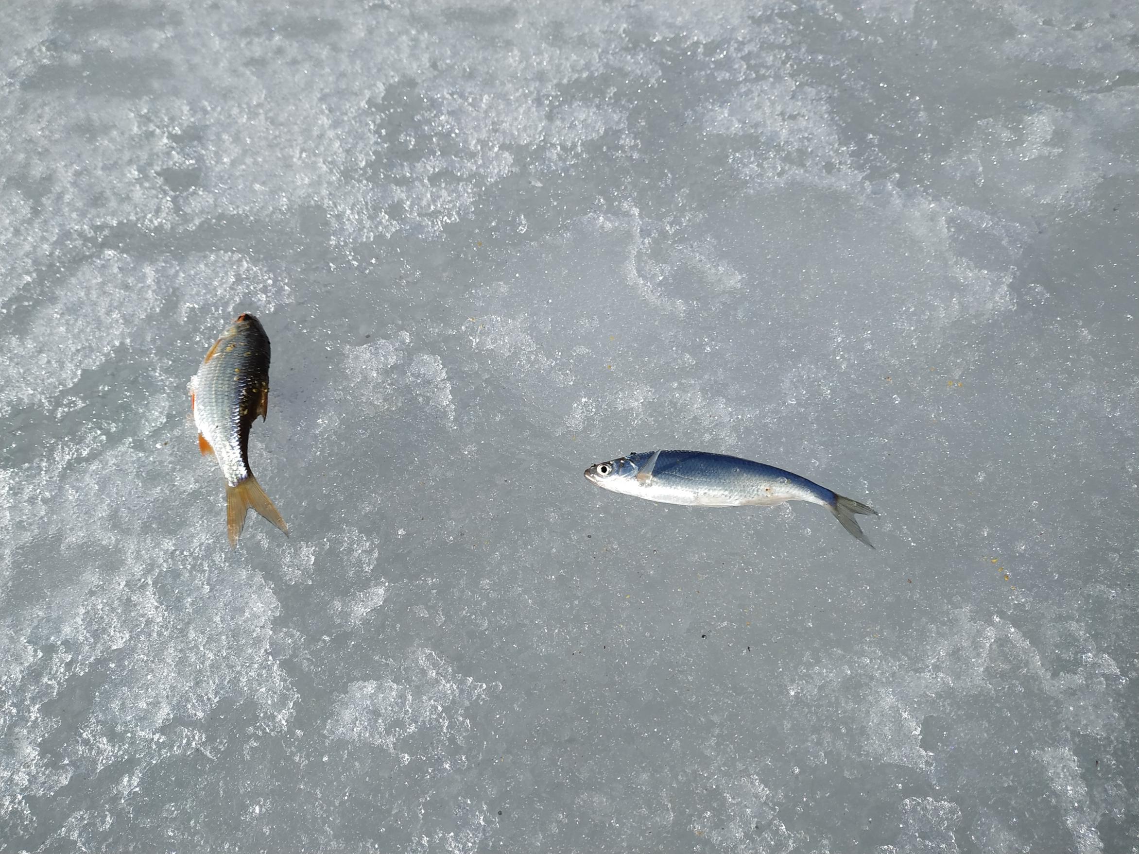 В одной из лунок снова обнаружил рыбу в 1.5м от льда. В этот раз получилось, мне удалось целенаправленно поймать 2 или 3 уклейки. Правда, после закорма сухим кормом сверху рыба пропала.