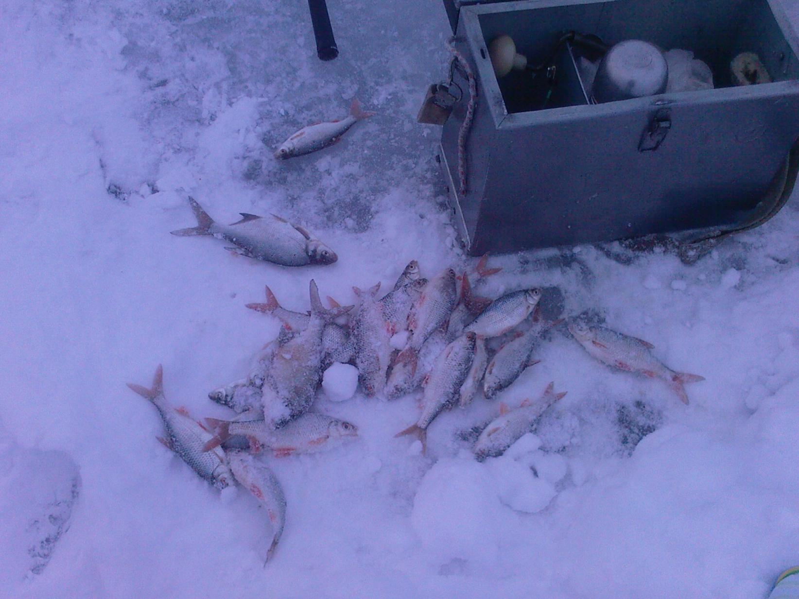 Вчера компанией первый раз в этом году посети сей водоем.Местом рыбалки было выбрано Дуброво,немного левее деревни на глубине 6,50-7,00 .На троих сделали 14 лунок из них 3 двойных.Кормили RS-универсал(холодная вода).С утра у друзей единичные поклевки,у меня полный ОП.И на свох и на других лунках у меня до 14 часов глушняк.До этого времени ловил на мотыля и на макароны.Потом перешел только на макароны,и понемногу дело пошло.До 16,00 было изловлено 19 плотвиц,2 нормальных и 4 мелких подлещика.В райне половины одинадцатого подходил продавец путевок,на троих оплатили две по 5 тыр,вроде как местные.По оплате денег прикинули так-ходит чел,морозит нос,руки,и ведь собирает он деньги не себе в карман а работа у его такая.Сам он тоже рыбак и рассказывал что и рыбу они запускали(щука,карась,карп)и скоро мы эту рыбу будем ловить и туалеты раставили.С этими сборщиками можно договориться,а мы на них с ледобурами в атаку.Но это все мое ИМХО.Ниже вымучаная рыбка.