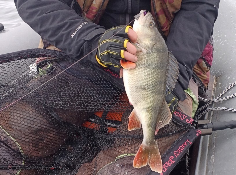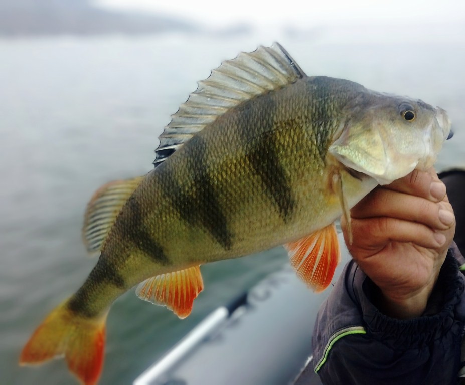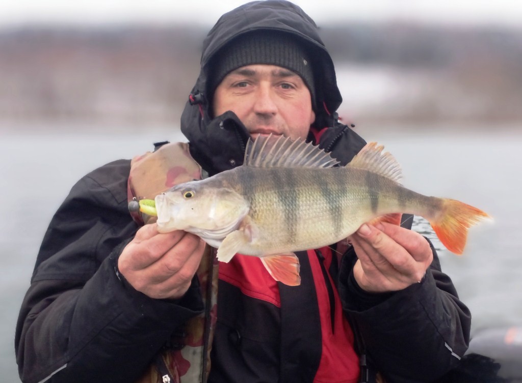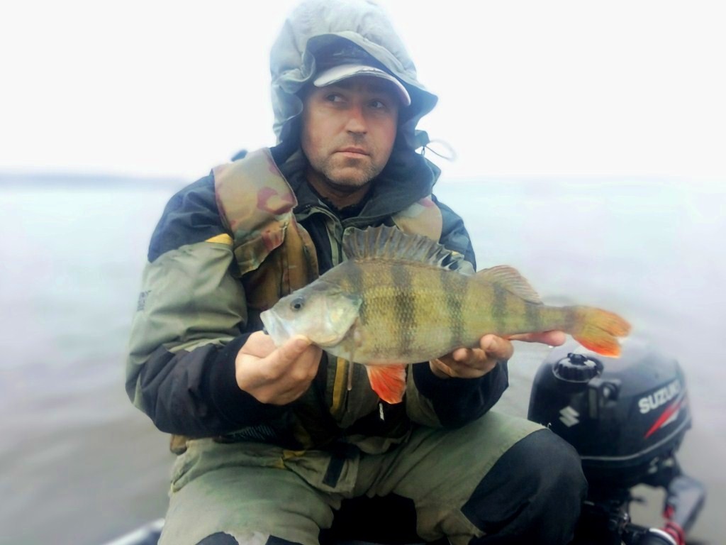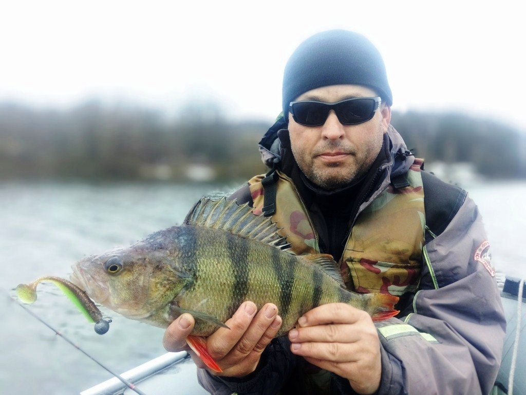 Ближе к дамбе около д. Дуброво, на глубине в 4 метра, когда виброхвост сваливался с валуна, следует характерный тычок. Рыба некоторое время «давит» в глубину, вывожу на поверхность солидного окуня. Хищник мотает башкой, всплеск, и только волны… Жаль.