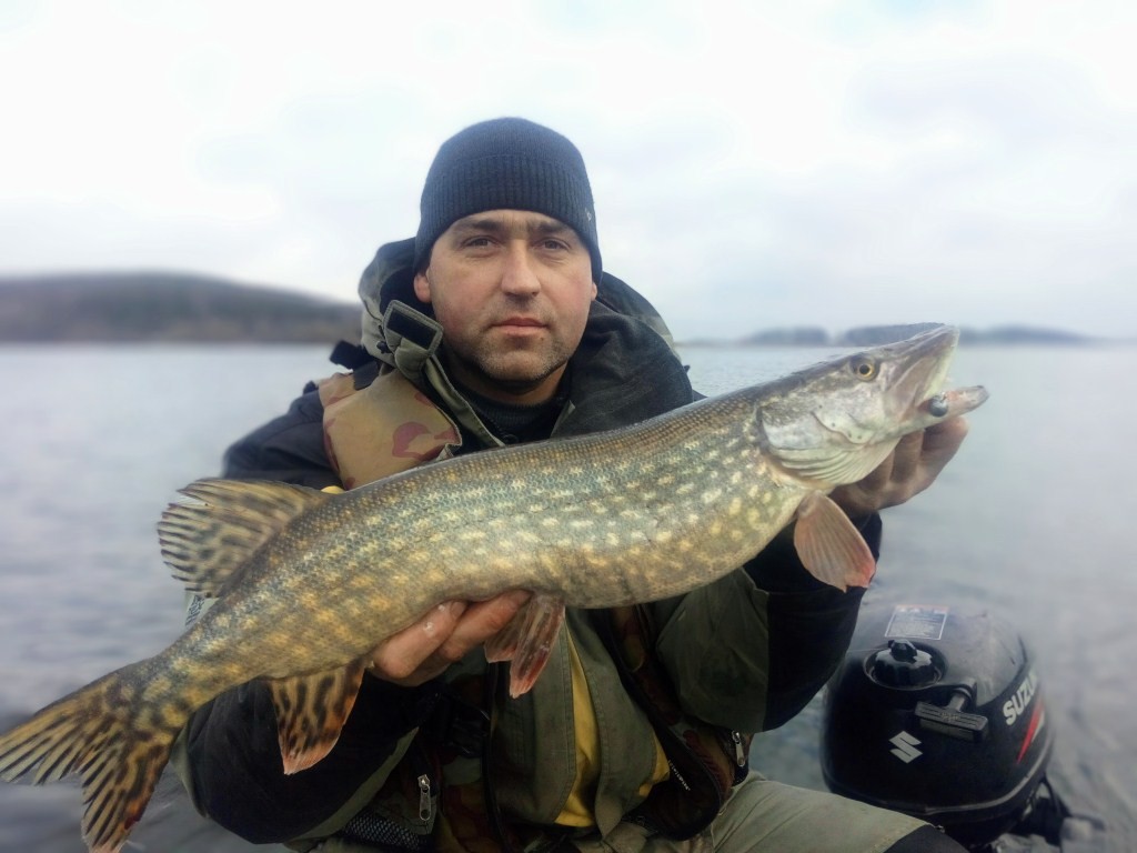 Проверив как наработанные точки, так и еще несколько интересных мест, остаемся с «носом». Двенадцатый час дня, часто радующий нас поклевками участок молчал. Принимаем решение переключиться на щуку и уходим «шарить по карманам». Напротив острова замечаем большое скопление бели. Глубина более 8 метров, ставлю виброхвост на джиг - головке 10 грамм, медленная проводка около дна с несколькими паузами. На третьем забросе уже под лодкой чувствую тяжесть. Подсечка, и быстро поднимаю небольшую щучку в лодку. Эге, экземпляр из вселенцев этого года! Понятное дело, отпустил. С этой постановки получили еще четыре поклевки, три реализовали. Одна рыба местная, весом за килограмм. Еще две щучки, размером как под копирку и с характерными отметинами на чешуе. Интересно, что с четким ударом взяла только местная рыбина, остальные садились без поклевки.