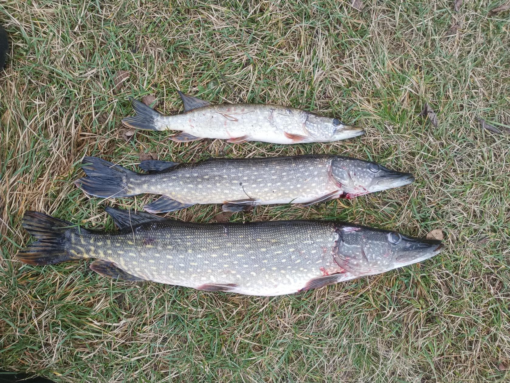 • Вот таких щучек удалось вчера "закуканить" на спиннинг с лодки на реке Свислочь, за несколько км. от впадения в р. Березину, в один из самых почитаемых праздников в бывшем СССР ( 3 кг., 1,5 кг. и 800 гр.). Самую мелкую пришлось брать, при извлечении приманки она получила повреждения жаберных крышек. Все щучки были пойманы на вертушку Мепс пятого номера в золотом цвете. На другие приманки: колебалки, воблеры, вертушки в другом цвете, хищницы не реагировали. Выходит, что одна приманка, уже в который раз по-осени, не оставляет меня с жирным нулем, за что еë изготовителям из Поднебесной: - "Вялiкае дзякуй!"...