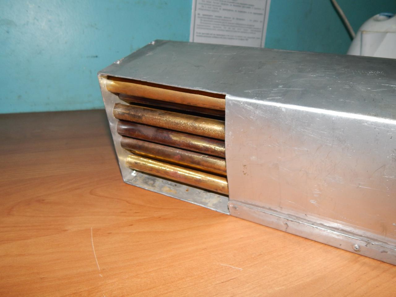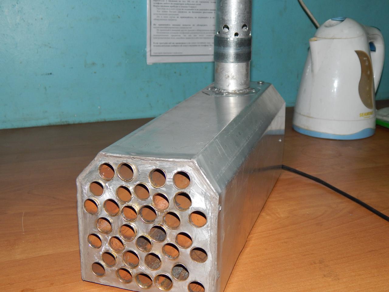 за основу был взят то копресси как на мой взгляд лучьший на рынке,но захотелось чегонибудь усовершенствовать;) был заказан кулер с приличьной производительностью и регулятором обаротов +тихий,что не мало важно,так что получилась ручьная регулировка,это мне кажется правильнее...энергопотребление от 0.15а.ч до 0.3 а.ч кулер вставил в корпус,это так же доработка и отличьная мех защита от ударов при транспортировке....корпус был сделан из 2мм дюраля и его теплопроводность в 3 разы выше нержавейки,трубки излатуни их теплопроводность так же в 4-5 раз выше нержавейки ,+увеличил количество трубок,теплосъем вышел очень приличьный труба на выходе чуть теплая(на выходе из то)так что теплосъём вышел на мнго выше даже самого пратотипа что был взят за основу.регулировку тягой сделал также отверствиями,но у меня это регулируется,можно закрыть или частичьно подпружиненной пластиной.дальше для более плавного распределения жары от гарелки гефеста был сделан рассекатель,каторый очень надежно и просто фиксируется на решетке гефеста.так же в гефест был встроен газ контроль...вчера успешно прошли испытания....было выевлено...что кулер надо отнасить не менее 4-5см от трубок(у меня 2 см)...для боее ровного распределения потока воздуха ребята с русфиш уже переделывали копресси вставляя вставку меж кулером...так как центральные трубки менее продуваются при заводской версии(проверил опытном путем)..вот пару фоток выношу на ваш суд и обсуждение...ибо в спорах раждается истина...