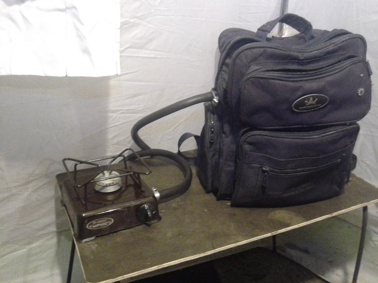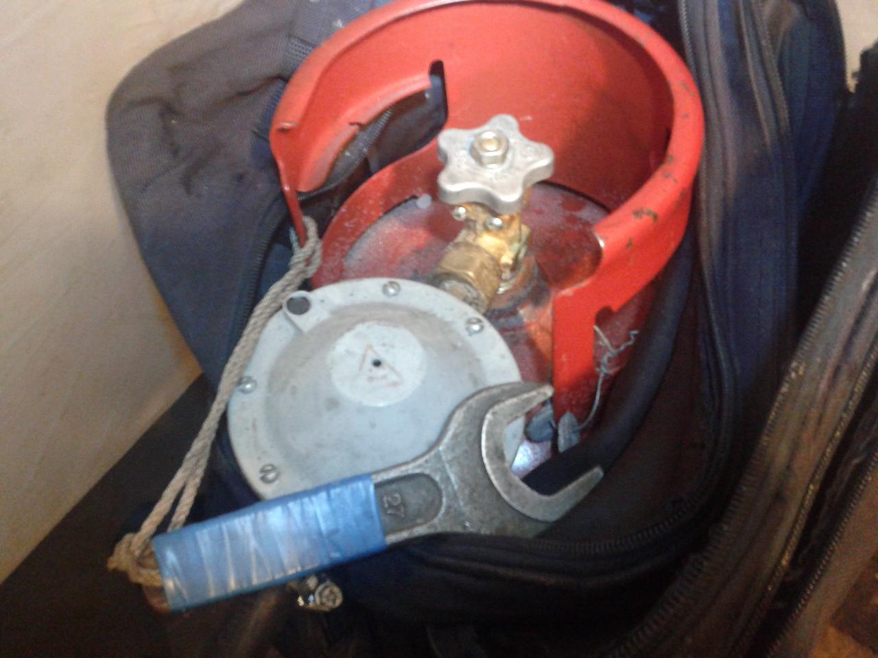 По наследству от сына остался школьный рюкзак, в большом отсеке хранится баллон, в меньшем - горелка. Шланг не отсоединяю