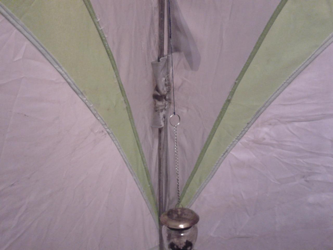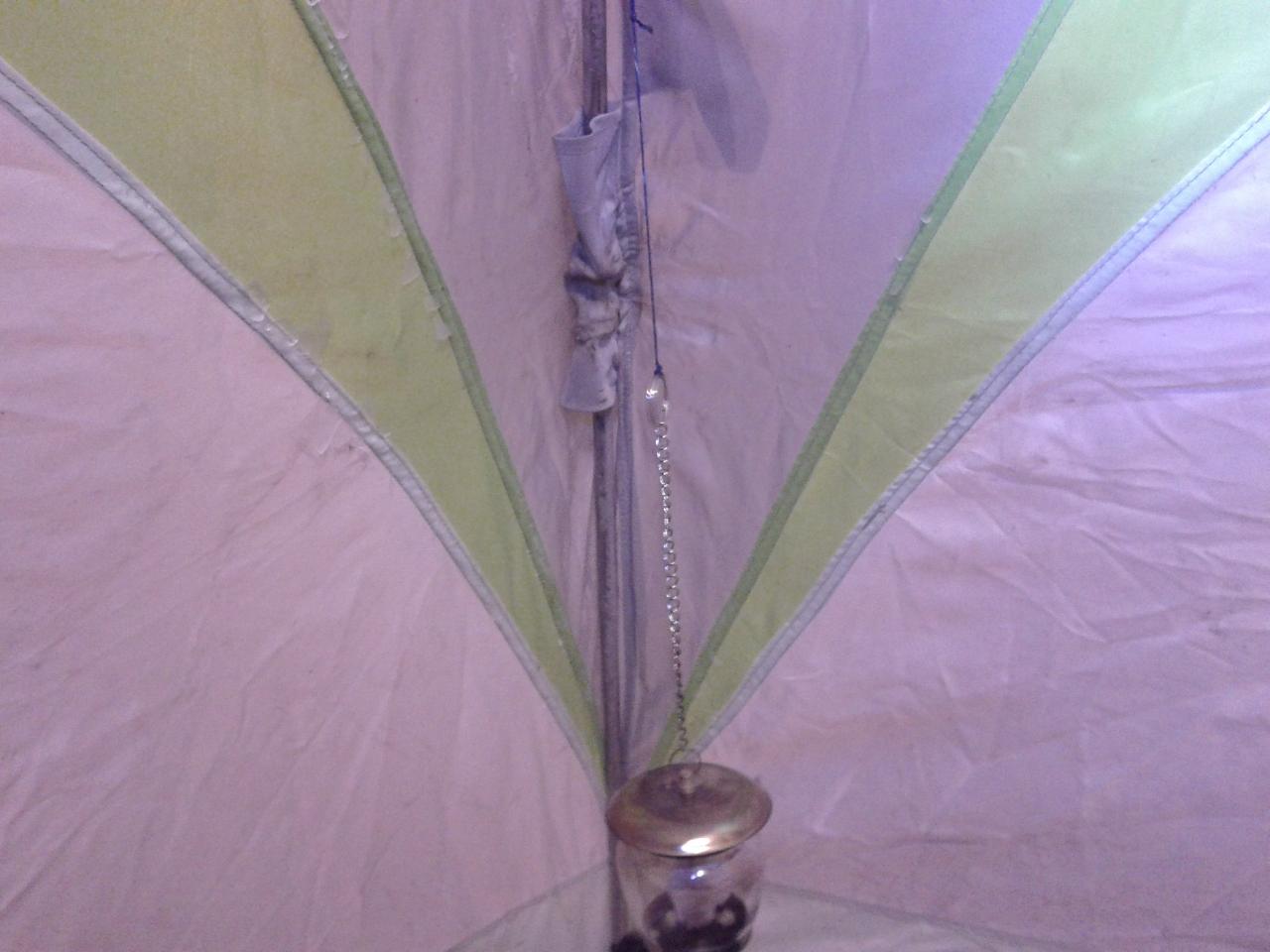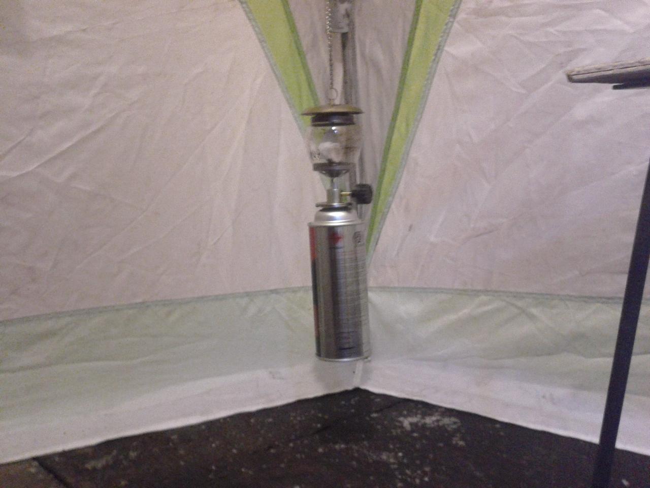 Каталитическую лампу подвешиваю на верёвочке к дуге палатки через петлю. Так она не сможет упасть и разбится. И ещё нет соприкосновения с холодным льдом. Ещё можно одеть на баллончик рукавицу или ещё что
