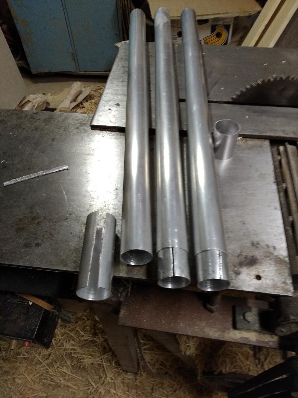 Все верно! в проставке вырезал сегмент, сжал руками, вставил и приклепал. Сколько вырезать посчитал по длине окружности ( С=Пи х D ). Проставка в длину 15 см, т.е. по 7,5 в каждую сторону входит. Сидит очень плотно, сжималась с трудом и как пружина прижалась к наружным стенкам. Труба была 50х2. Купил 3 м. (что-то около 30 р.). Сделал три куска, но третий не использую. Высоты хватает.
