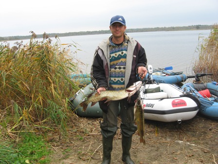 Обычно пятница – короткий день, а в этот раз директор в отпуске, а потому пятница у меня получился выходным днем. Забираю ЕГОРа, выезжаем из Минска в начале одиннадцатого. Звоню великому, он уже тоже в пути. Примерно через пару часов мы уже на берегу. Нас встречает наш друг, который приехал раньше и уже успел половить. Показывает три щучки, взвешиваем: 0,84, 0,9 и 2,86 кг. Последняя нас впечатляет, заставляет ускорить процесс переодевания, накачивания и тп. Традиционный перекус и, наконец-то, мы на воде. Кроме нас, вижу пока только одну лодку. Разбредаемся кто куда. На третьем забросе у меня садится шнурок. Отпускаю. Через пару забросов – опять. Потом снова и снова. К счастью, все повреждения совместимы с жизнью, шесть малышек отпущены. Что ж такое, где же рыба. Подплывает великий. У него четыре штуки визуально от кг до полутора (последующее взвешивание показала вес большей 1,58кг). Ну не то, чтоб нервничаю, но осадок присутствует. Очередной заброс приносит маленького окуня, потом еще одного грамм на 250, окуни мне без надобности, отпускаю. А вот щуку хочу. Что ж пора на берег, ну еще заброс, и есть! Вот, блин, заглотила ж… Вес в районе кг, ну что ж, все равно приятно, заодно обновил американьски подсак (понравился).