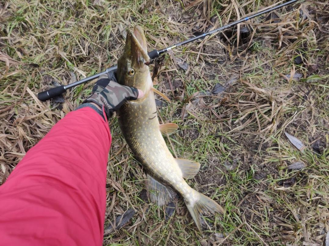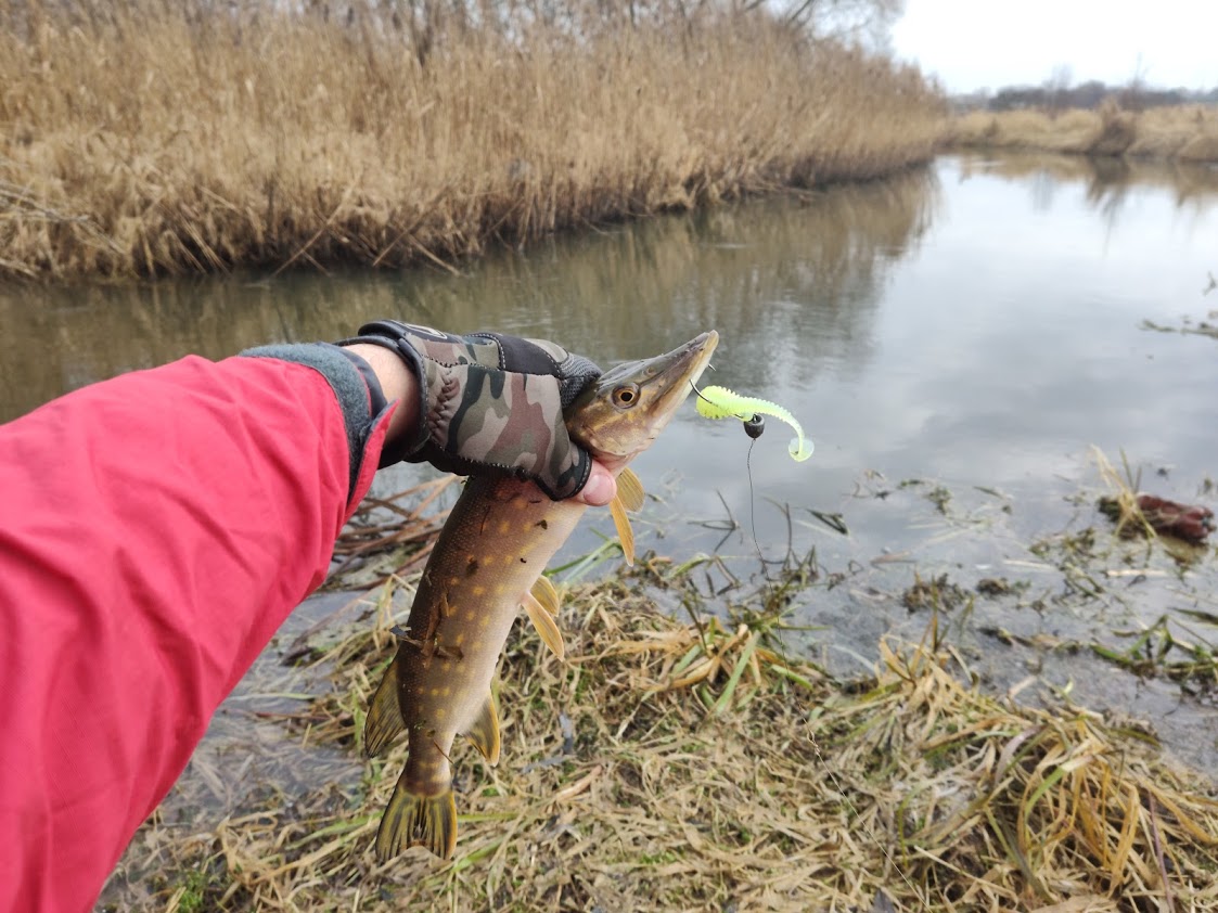 Через час щучья классика - глубокий затишок около вогнутого берега дарит следующую поклевку! Поклевка слабенькая, и произошла после десятка забросов, и облегчения чебурашки со стандартных 10-ти до 6-ти граммов. Полкилошный шнурок жадно по-зимнему заел резинку.
