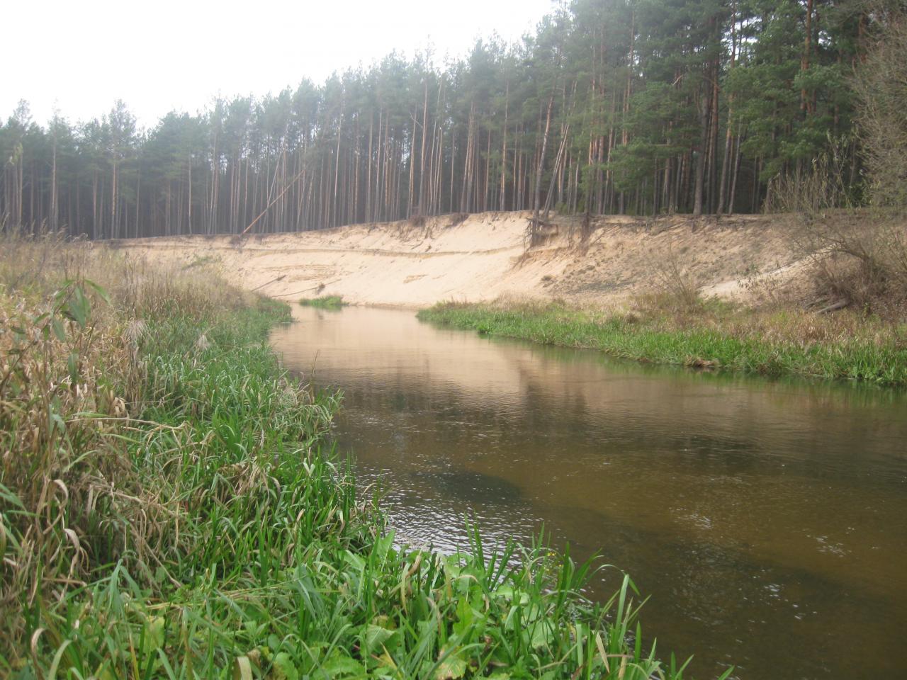 Дальше выхожу на спрямленнный участок речки. Надо полагать, в советскую эпоху тотального реко-уничтожения мелиорацией не хватало показателей? Иначе нахрена спрямлять речку в лесу? И так пойма узенькая. Кому она мешала там?