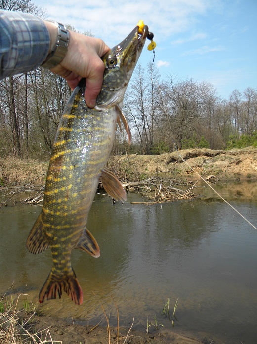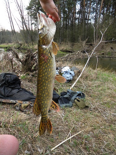На речке хорошо. Упала и посветлела вода, солнышко и теплынь - гуляй от души.:p Приятель сообщил, что у местных дня три нету клёва. Это нечего не меняло, собрал спин и пошёл искать щуку. Со щукой уже становится всё ясно. Попадаются два размера, небольшая и чуть побольше. :mrgreen: