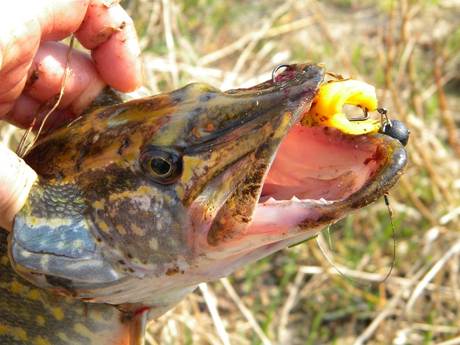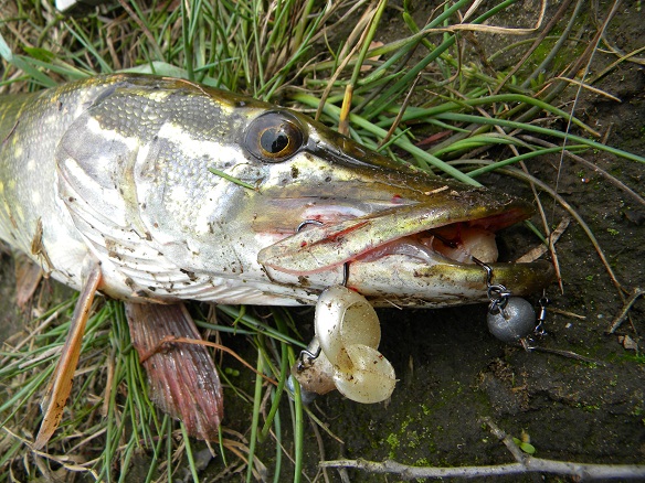 Остаётся совсем не много времени и решаю дальше не идти. Делаю несколько забросов в этом же омуте и ... Оппа! Чёткая поклёвка на свале в яму! На силиконе явные следы зубов. Ещё пару забросов... Опять! И снова! Да что же это...? Засечь не могу. Наверное шнурки балуются. Незацепляйку-незасекайку меняю на стандартный джиг и как обычно, на последнем забросе садится-таки..., но совсем не шнурок. На сей раз всё просто. Немного помучился с бешеной течкой на русле и щука-полторашка на берегу.
