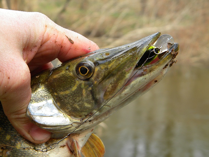 Азарт вспыхивал вновь, как только я выходил на интересную точку. На очередном "вкусном" месте решаю сменить тактику и проверить поворотную ямку с полным набором корчей и завалов у противоположного берега. Уверенная хватка, на риппер-незацепляйку, случилась недалече от завала. Сопротивление было таким активным, что распереживался за исход этого мини-сражения. Всё-таки "незацепляйка" - она же и "незасекайка", да ещё через струю тянуть... А вдруг плохо засёк? Но выкачав щучину на берег увидел, что оффсетник пробил верхнюю челюсть аж в двух местах.