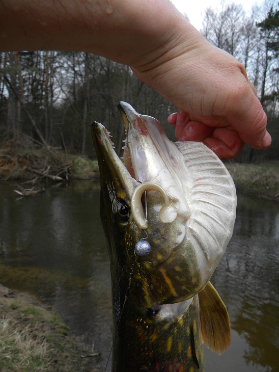 на первых-же забросах понял-щука есть правда и коряги с затопленными кустами тоже, на третьем или четвертом забросе сильнейший у дар на паузе- ну думал ломану, потом еще несколько тычков, в итоге три щуки-одна из которых чуть за килограмм, а две грамм на 500-600 или того менее , если-бы не глубокий заглот, то без раздумий отпустил расти дальше, но как не прискорбно не жилец(жабры поврежденные)