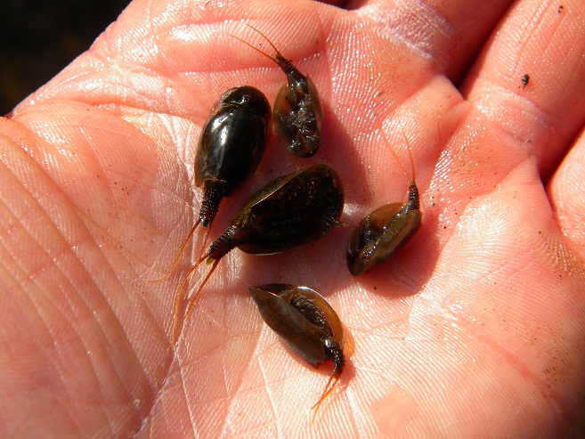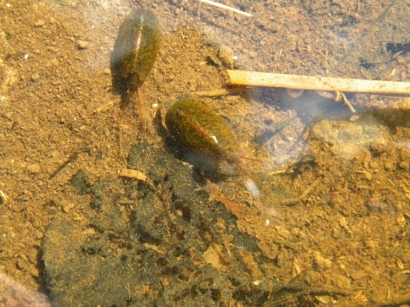 Устраиваю перекус на живописном обрывчикеи вспоминаю, что хотел поискать шитика для будущей фидерной рыбалки. На самой речке его по прежнему не видно, но нахожу лужу оставшуюся после разливов и шитиков там ..., каких хочешь: мелкие в песчаных домиках, средние в домиках из ракушек и мелких травинок, крупняк в коттеджах из веточек и листьев. А между ними, копошится на дне множество щитней.:o И в качестве секьюрити, прям по центру лужи, здоровый водяной паук.