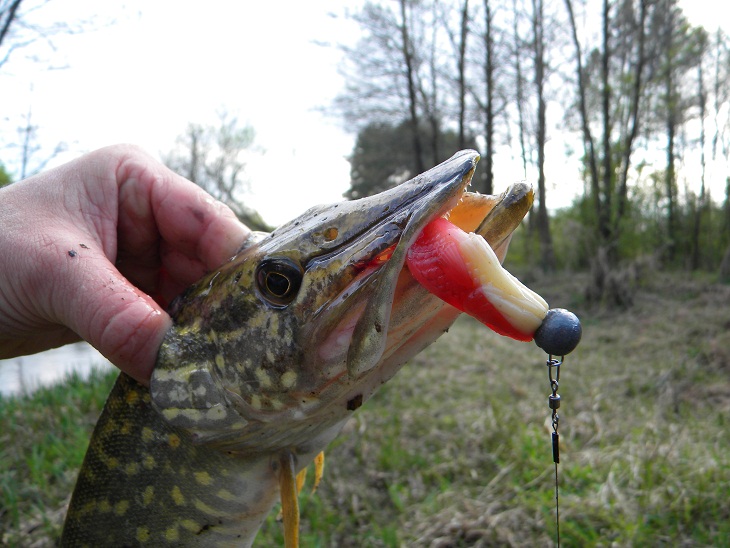 В этом году не поехал к бабушке за пасхальными булками, а решил съездить на новые для меня речушки. Дорога в итоге заняла три часа, пришлось походить немного по полям, кустам, болотам и лесам, зато побывал на трёх интересных речках. Было солнечно и жарко и щучка, наверное, стояла мордой в берег или отлёживалась на ямах и поэтому не особо реагировала на мои приманки. Берега оккупировали жабы, только и слышно – буль-буль, когда идёшь вдоль берега. Под тенистым берегом я всё-таки уговорил взять одну «жабку» мой двухвостый твистер. Поперёк щучки были отчётливо видны следы от челюстей её намного большей родственницы. Ну что ж, раз она так боролась за свою жизнь и не была съедена, то и я не смог её забрать, а отпустил в родную стихию:). Порадовало то, что значит есть здесь и довольно крупные экземпляры. И вот на очередной довольно глубокой ямке такой экземпляр схватил мой твисиер:o. Спиннинг у меня не хлипинький был: экстрафаст тестом 7-21 г, но скрутило его - будь здоров. Сначала шли мощнейшие потяжки, потом она пошла вверх по течению, заставляя трещать мой фрикцион. И вот тут я, скорее всего, сам допустил ошибку – отпустил ручку чтобы немного поджать фрикцион, но тут рыба делает резкий разворот и стремительно идёт по течению на меня… образовывается слабина и я достаю своего покоцаного твистера... вот же досада:(. Руки трясутся, но я продолжаю простукивать дно ямы, пробую менять разную резину, поролон, отсаживаю два джига, но всё безрезультатно – больше поклёвок не было. К обеду стало ну очень жарко и я больше ходил смотрел на речку, чем ловил. Жалко батарейки сели на фотике и он включался через раз, а пощёлкать было что. Вот такая получилась пасха.10 Фото