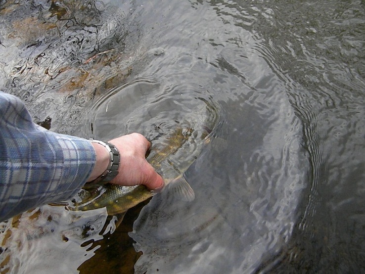 Подхожу к чудному местечку. В таком рыб просто не может не быть. Речка делает разворот на 180%, а сам поворот "зажат" перекатами образованными поваленными деревьями. Начинаю не спешно облавливать. результат ноль. Продравшись сквозь бурелом в самый центр, между двумя перекатами, пытаюсь сделать заброс. В результате удалось только дважды чудом сдернуть с веток приманки. Однако решаюсь на третий заброс, мягкий твич, удар. После неспешного вываживания, сверкая серебристыми боками, на берег был извлечен первый в этом году язь.