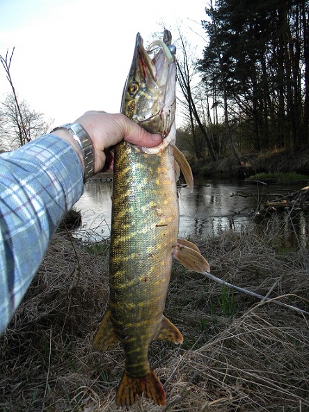 Ловится красиво: выходит из под противоположного берега и дерзко атакует. Атака видна и это ещё больше кэйфа.:mrgreen: Рыбу отпускаю и буду ждать когда она подрастёт. Пока щука занимает на речке определённые участки, что будет дальше посмотрим. В конце рыбалки попался окунь, пузатеньний, а значит с икрой. В речке много малька, сегодня он гулял кругом. Был один красивый всплеск, засёк, подошол побросал, но без результата.