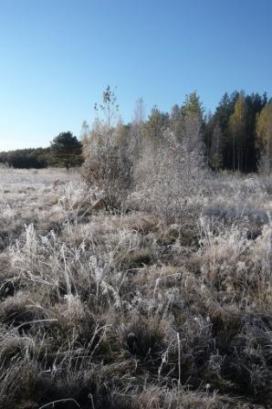 Спускаю лодочку на воду. Продираюсь по этой канаве, ломая тонкий ледок и засохшие ветки мертвых лозовых кустов, стоящих в воде. Выплываю. Похоже, это очень старый выработанный торфяник.