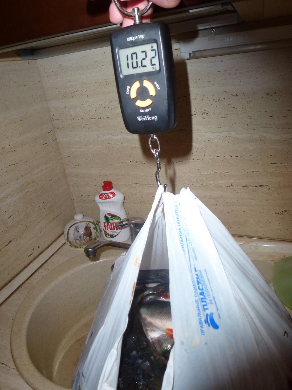 Вес окушат 10220 грамм, правда там среди них, вернее под ними лежал шнурок, вес которого мы по позже отгадаем.