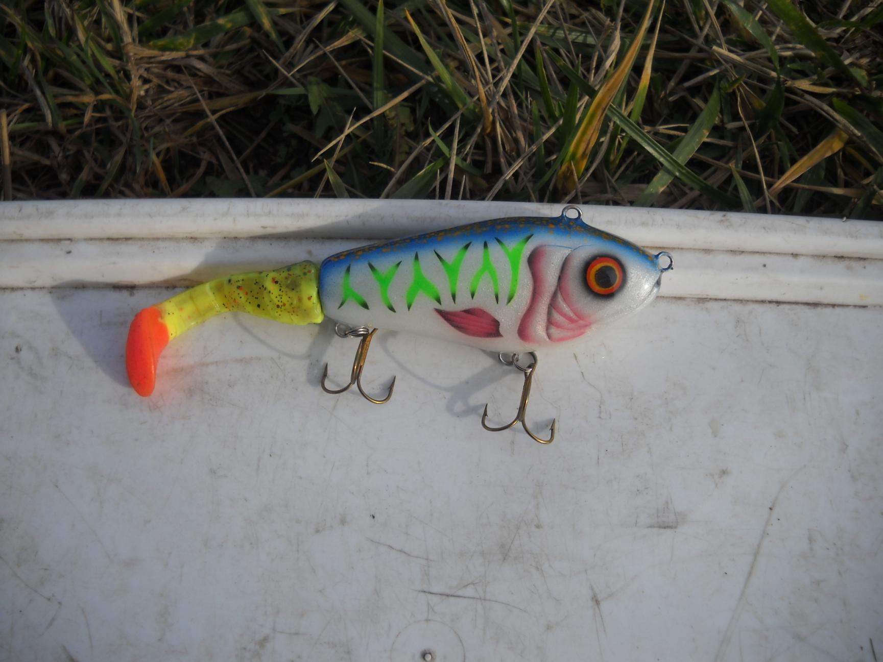 В приманке сделал две петли, та которая на носу служит для ступенчатой проводки либо равномерной ( с хвостом), зацепив приманку за петлю на спине и сняв хвост , приманка начинает работать наподобие ратлина, вес малыша 72гр при длине тела 10см (с хвостом 16см), делал специально для ловли на реке.Нажмите на изображение для увеличения.