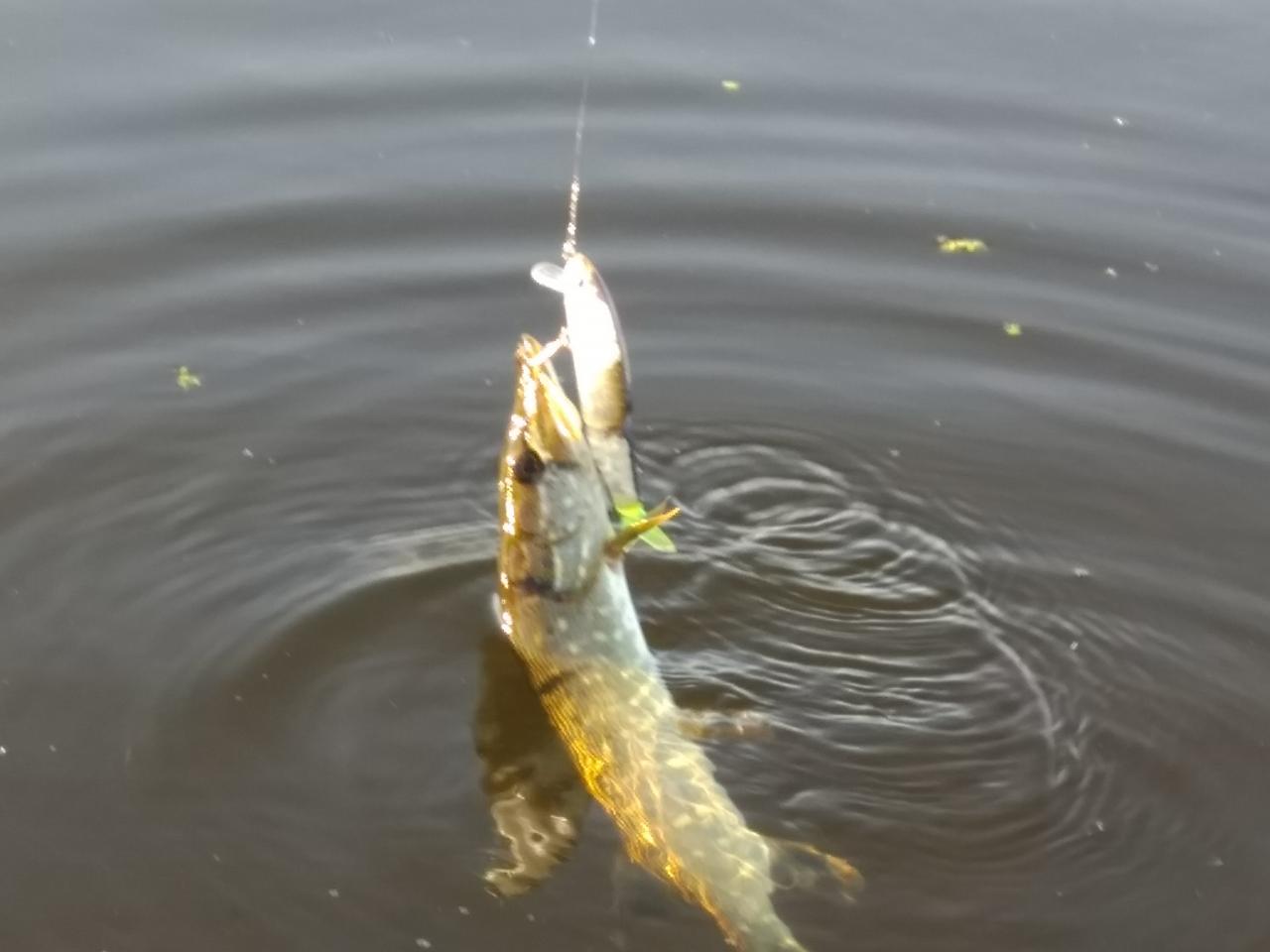 Дальше ,танцы с бубном, и ещё одна(850-900) Эта была посажена на привязь,до лучших времён.Не фотил т.к время уже поджимает на ,орбайтен,.Был ещё один сход достойной щучки но обдурила.За пару секунд проскочила метров 20 на меня и под лодкой сошла.Предпочтений не заметил.Что кислота -что натуральном да и твич был разныйБыло еще два выхода-промаха в окнах кувшинок на ,типо,-магалон.К десяти подошёл к ещё одной проверенной точке и там мне испортил последние полчаса отведённого времени Ентот монстр .Полтора десятка минут он мне адреналина подкидывал.И за испорченную ,точку, был посажен на кукан.Всем НхНч..