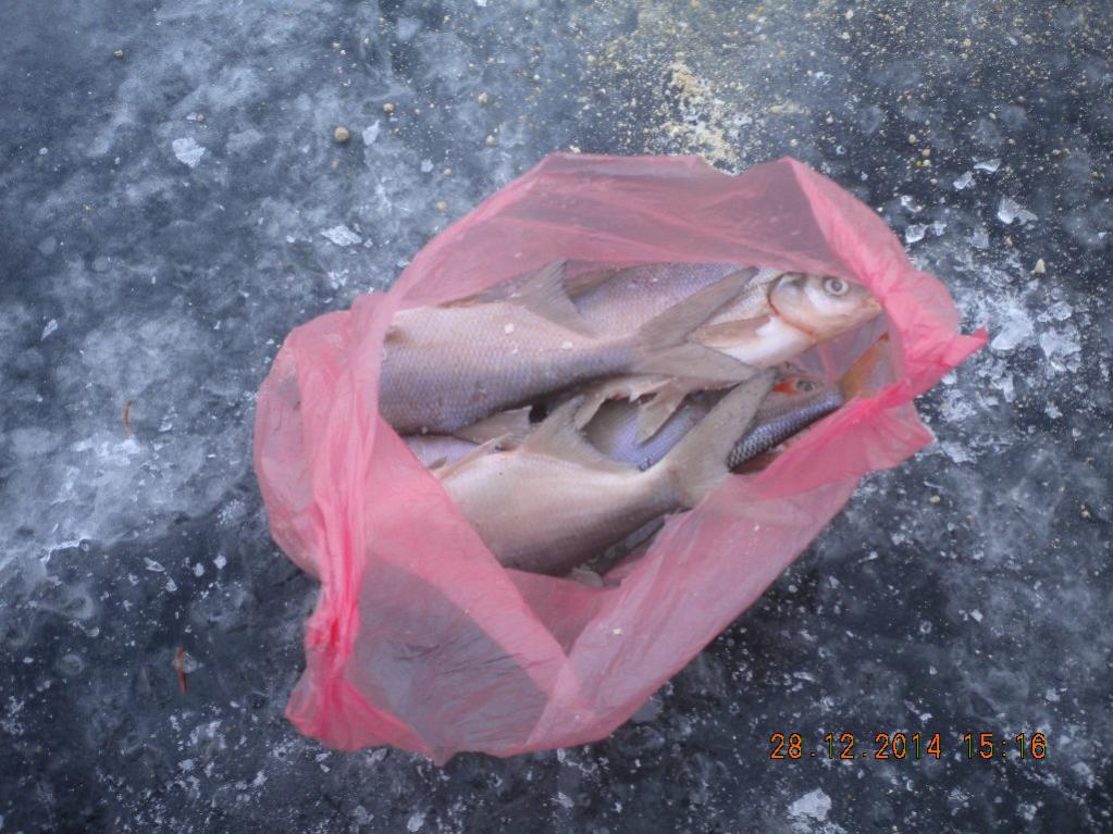 На рассвете прибыл на дамбу,перегрузил рыбацкий скарб в сани и смело ступил на лёд.Ловить решил метрах в 300 от водосброса, в выбранном месте глубина была 5 м.,+- полметра на разных лунках.Сделал две пары метрах в 20 друг от друга и несколько лунок в хаотичном порядке. Пары закормил : РС лещ блэк(остатки с осени),сухарь да семка, лиманника полста граммов, ещё трохи замороженного крупняка. Хотелось лещов. Нетерпеливо зарядил две поплавочки ,по 4-5 мотылей на крюк, закинул,вперился.Ждать пришлось недолго,вот уже первая плотка глотнула полными зёбрами морозного воздуха, а я,триумфально потрясая балалайкой,победоносно окинул взором акваторию!Сей факт остался незамечен... Рыбаков было немало,некоторые ютились в палатках.Морозец держался все время,лунки из 130 стали к трём часам где-то 85.Толщина льда сантимов 15 как минимум. На рыбалке старался не шуметь и не стучать,да и вообще вёл себя смирно, но до леща так и не достучался,как и до его внучатых племянников.Ловилась исключительно плотва и только на мотыля,репейником брезговала. Сколько на крючке мотылей-1 или 5,ей было по-барабану. Чертил.Старался.Но чёрт попутал только одного окуня. В три слинял, младшей нужно было леки купить.33 плотки и один окунь,без малого 2 кг.Отдохнул прекрасно,рыбка клевала,от города рядом-что ещё надо!?
