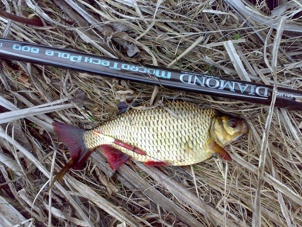 Карась клюёт. Причём не со дна а в полводы и выше. Или термоклин ещё там (пруд, полагаю, глубокий, бо сразу за деревьями в воде уже под 2м было) , или у дна слой сероводорода , а возможно и дерьма. По этой же причине, предполагаю, карась тамошний не знаком с мотылём. Ловят его на растительное. Я на манку ловил. Сперва попался один в грамм 200. О, думаю! Ща попрёт!