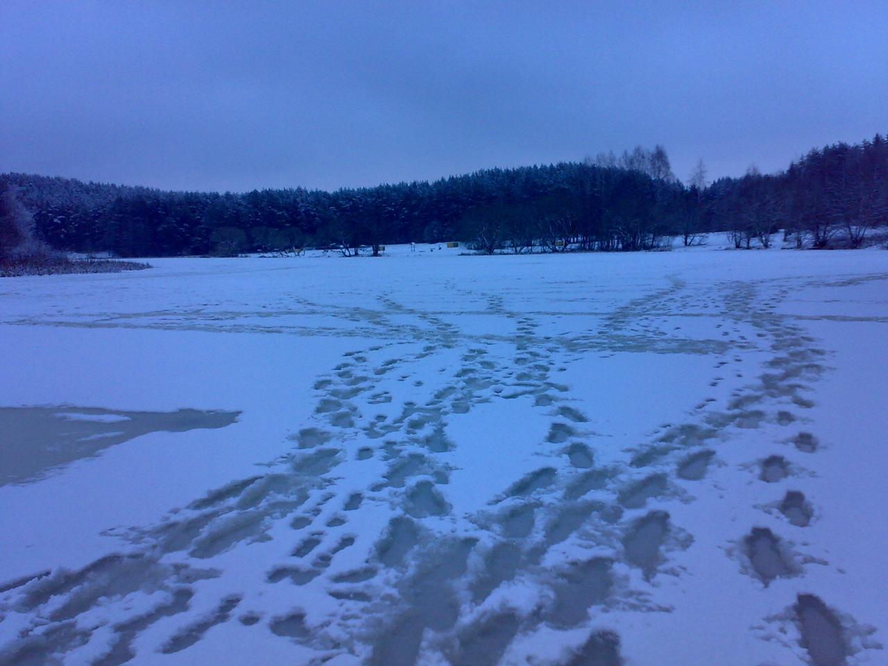 ...Вчерась Днюху Санькину праздновали, по славянской традиции взрослые дядьки с тётками порции антигрустина в себя заливали лейки до краёв, как только суперуверенность в членах и ясность в мозгу появились, не спеша тронулся к 7-му пляжу на Вячу. В полчетвёртого был на месте. Состоянию льда, несмотря на дристалища в виде пропитанной водой снежной каши на нём, был удивлён очень, примерно вот так - :o:o:o:o:o:o На льду по всей поверхности направо и налево масса следов и лунокНажмите на изображение для увеличения.