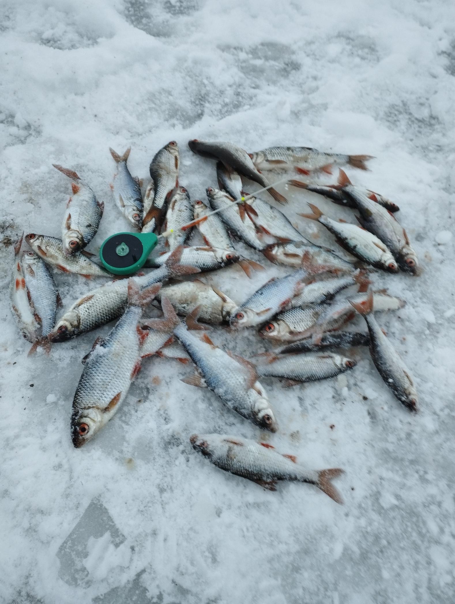 Сегодня решил изменить место дислокации с Комсомольца на Ёлку, пошел в правую сторону от дома отдыха. Остановился на не паханной сотке, где не было рыбаков, хотя это не лучшая тактика, глубина 4,6-4,8 м., примерно посередине водоема. К 11 закормил 7 лунок, добавлял немного лиманника. Ловил на кивок, мормышка-мотыль, леска 0,076. За два с половиной часа не поимел ни одной поклёвки, даже касания мормышки не было, даже ерша или окуня не состоялось. Естественно подумал, что пришло особо глухое глухозимье, и вдобавок сел на место, где плотва зимой скорее всего не живёт. Но скажу наперед, что ошибся. Метра в 150 была небольшая площадка, плотно засверленная старыми лунками. Решил засверлиться и закормить там пару лунок. Через пол часа проверил первую лунку и сразу же словил две плотки. Перешёл на вторую лунку и ещё 4 шт. Вернулся к первой и опять поклёвки. Рыбка клевала жадно и не смотрела на глухозимье. Добавил ещё 3 лунки и во всех были поклёвки. Через час вернулся к первым лункам, подумал может включили рубильник и там. Но за два круга ни одной поклёвки. Опять вернулся на новое место,на разнокалиберная плотвичка поклевывала. Но первое место не давало покоя, неужели там так глухо? Часов в 16 ещё раз туда вернулся и оказалось, что и туда подошла плотва, работали все лунки, серии по 3-5 шт., не прошло и 5-ти часов. Клевало и на игру, и со дна, после 4-5 проводок, лучше со дна. Уходил в 17, ещё клевало. Лёд хороший крепкий, сверху сантиметров 5 снега, но ходить комфортно. Рыбаков было в поле зрения совсем мало, некоторые в обед уходили. Погода благоприятная, ветра практически не было, лунки слегка подмерзали, ловить было комфортно.