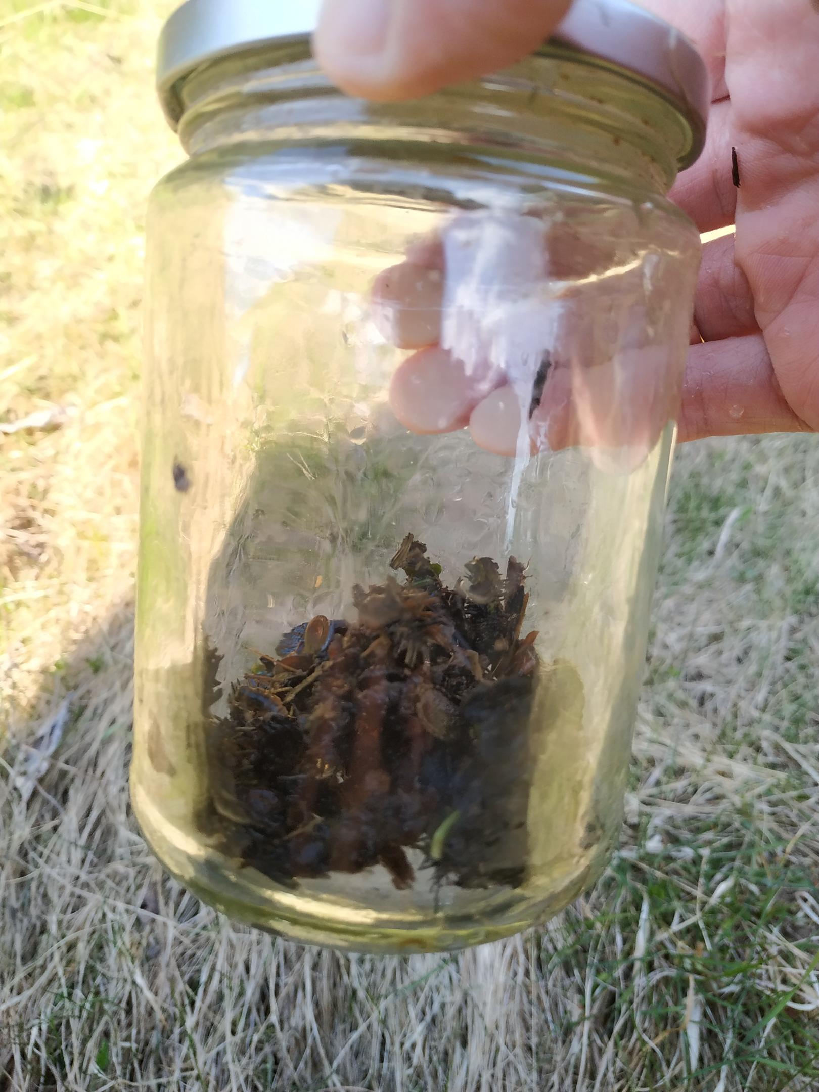 В верховьях все спокойно, был замечен один рыбак и несколько машин отдыхающих. Уровень воды уже низкий, но еще не совсем болото. Поискали шитика - попадается немного, но мелковат. Может рыбачки отфильтровали уже. За 20 минут насобирали немного, рыбак за это время, вроде как, ничего не поймал.