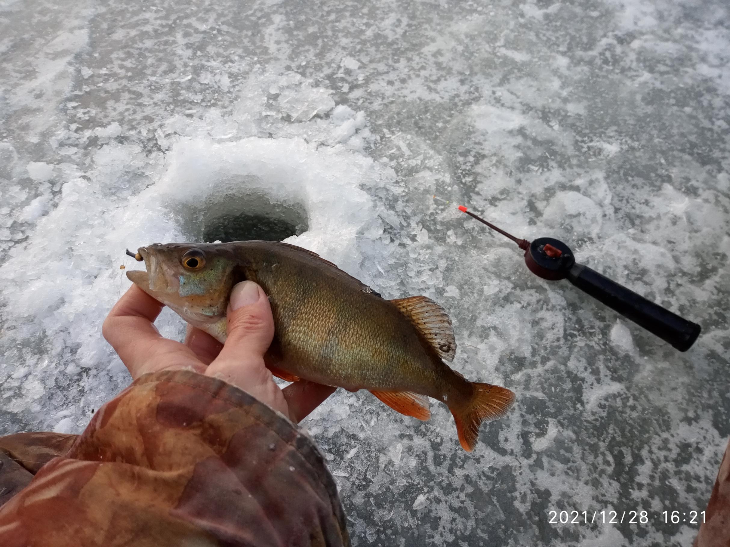 Сегодня с утра опять в районе Мочан, с города выезжал -13, приехал на Вячу -18. Порыбачил до 12ч, сегодня 5 окушков, один около 100г. Клёв никакой, просто повисает на блесне, без удара. На балансир ноль, только блесна работает.1 Фото