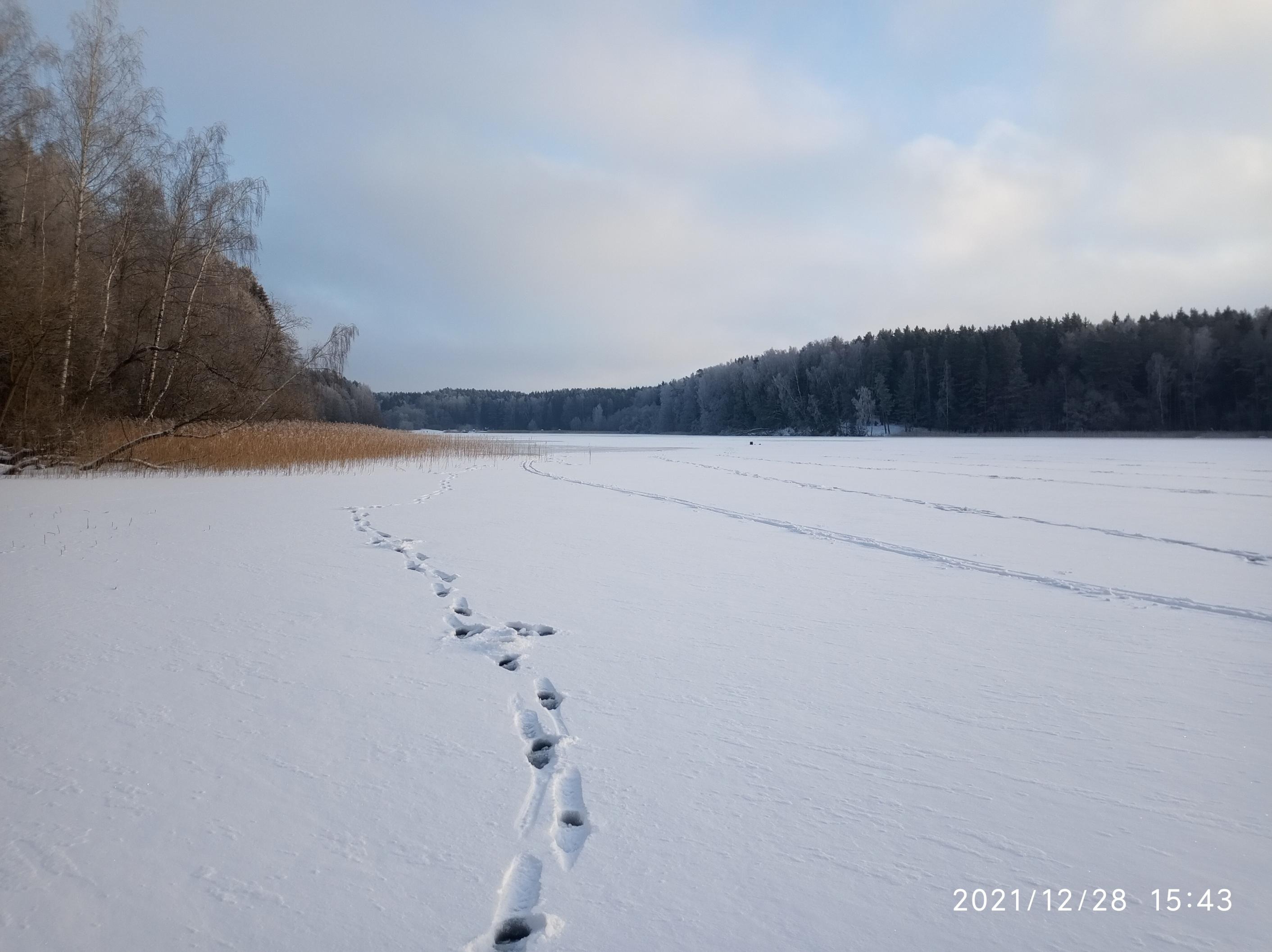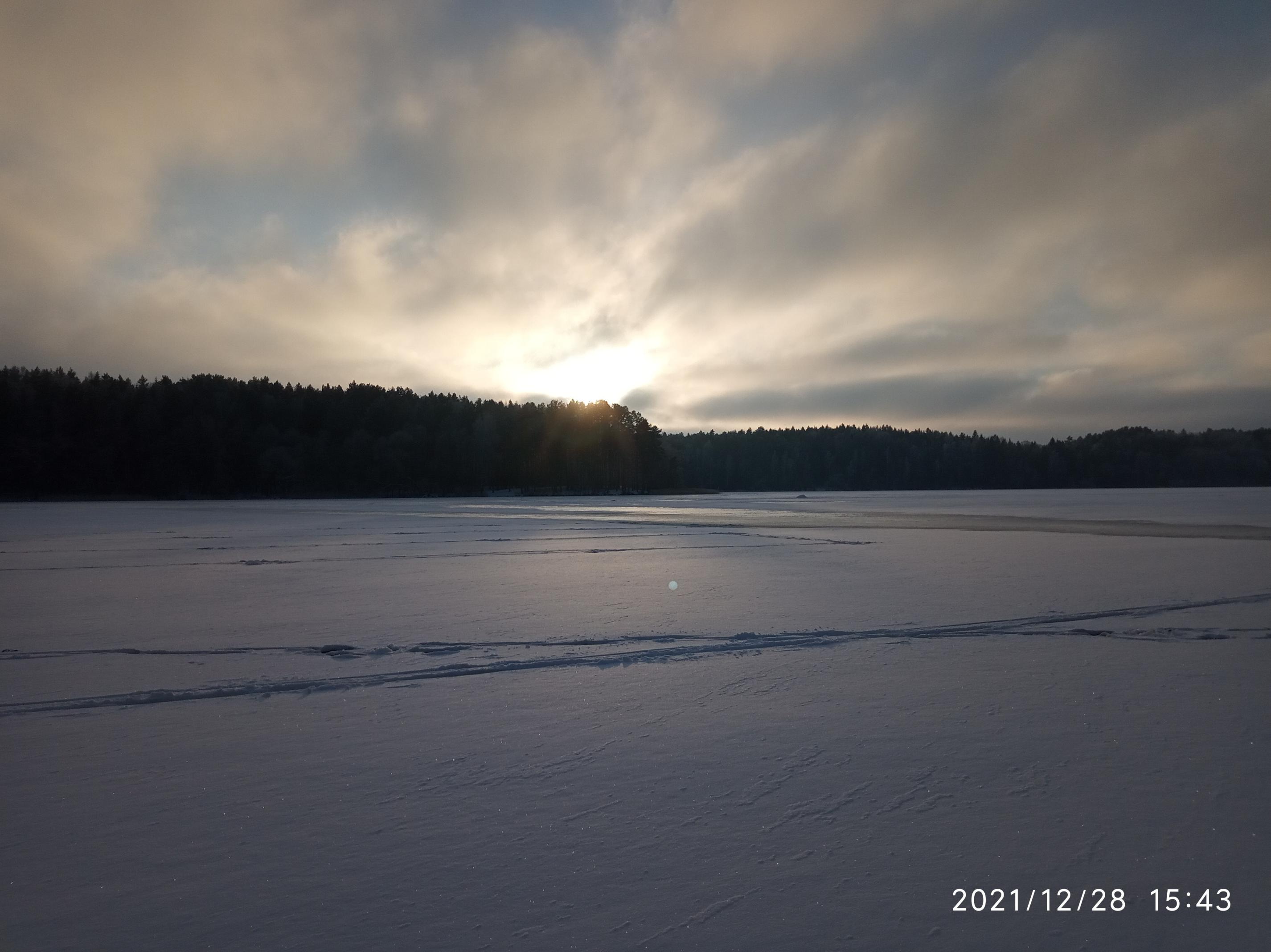 Лёд неплох. Смёрзся хорошо, двойного его за рыбалку ни разу не встречал, и сухой. Приятно передвигаться по такому. В пятнах снега. Но разной толщины в местах разных он встречается. Самая слабая толщина в одном месте была - сантиметров 7-8 на глазок примерно, руку не всовывал, точно не скажу. Ну а так - в районе от 10 до 15 см точно есть, местами толще. Нормально, морозики подкинут ему трохи толщины ещё сейчас, и будет совсем красиво и прекрасно со льдом там.