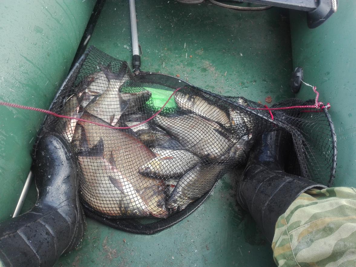 Ловил в воскресенье на том же месте с 7-00 до 14-00. Кормил Трайпер лещ зеленый плюс перловка.До 11-00 ловил на мотыля но результат не впечатлил - изредка попадались плотва и небольшие подлещики. Решил тогда половить на перловку плотву. Клевало почти как на Чёрных камнях - только успевай закидывать. Пока не набежали тучи и не влупил ливень с грозой.