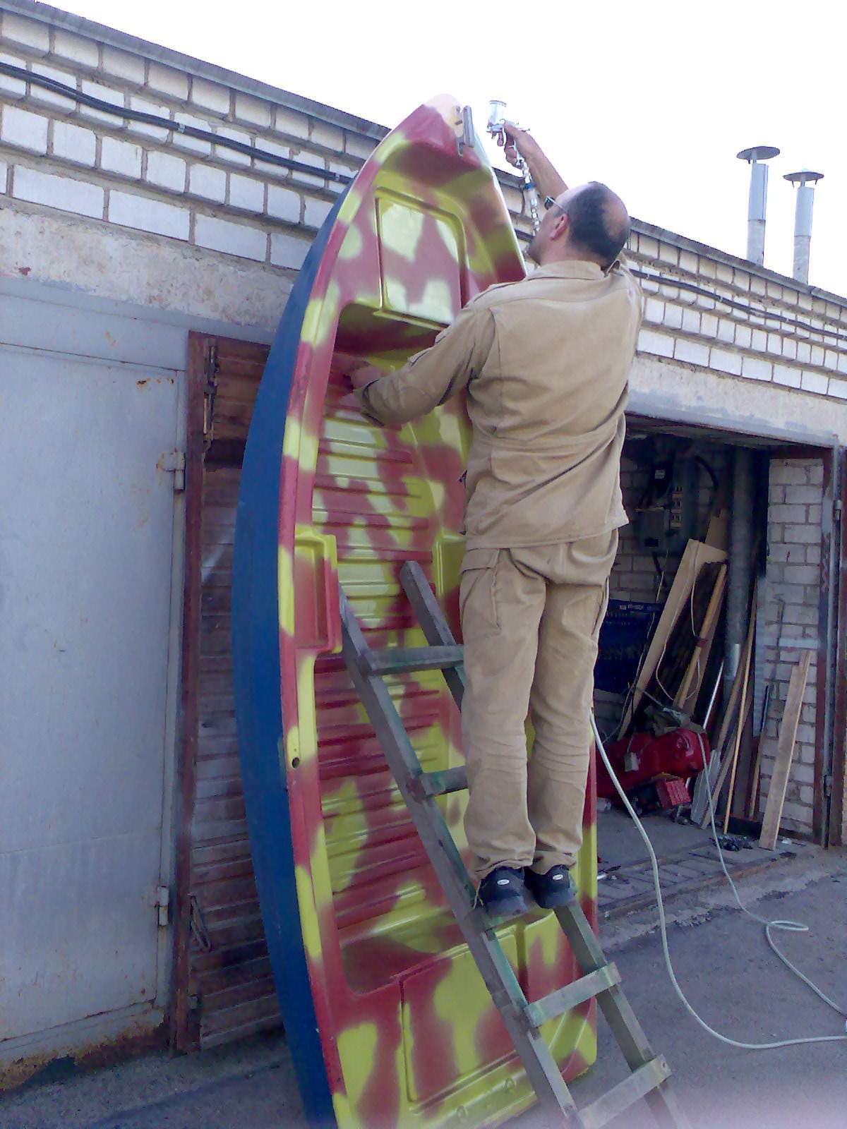 Особо поравился совет тёзки с motolodka.ru: "вначале корпус весь покрываете серым - это основа. затем без трафаретов ибо будут резкие перходы наливаете в пульвер коричнивую краску, выпиваете сотку и наносите пятна. выпиваете вторую и пуляете зеленым. добавляете бутылку пива и где Вам кажется излишне весело -метите черным. Пятна и полосы особенно придают корпусу зрительное увеличение. например преобладание вертикальных полос -зрительно корпус делает выше, горизонтальные - длинее и стремительнее. я тоже не Леонардо и долго не решался, позвал товарища. ему то не жалко чужой лодки он свободно и разрисовал и неплохо"