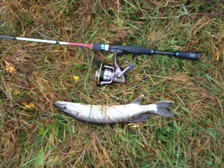 Перешл на блесны. Заброс, удар - фрикцион трещит, UL палочка в дугу. Рыба ну никак не хочет из воды вылазить. Минут 5 повоевал, наконец всплыла - выпрыгивает из воды, но к берегу не в какую... еще минут 5 повоевал, рыбка устала, на берег вытащил. Оказался Лещ 1.3кг. Вот таким вот сюрпризом одарил меня сегодня батька :)