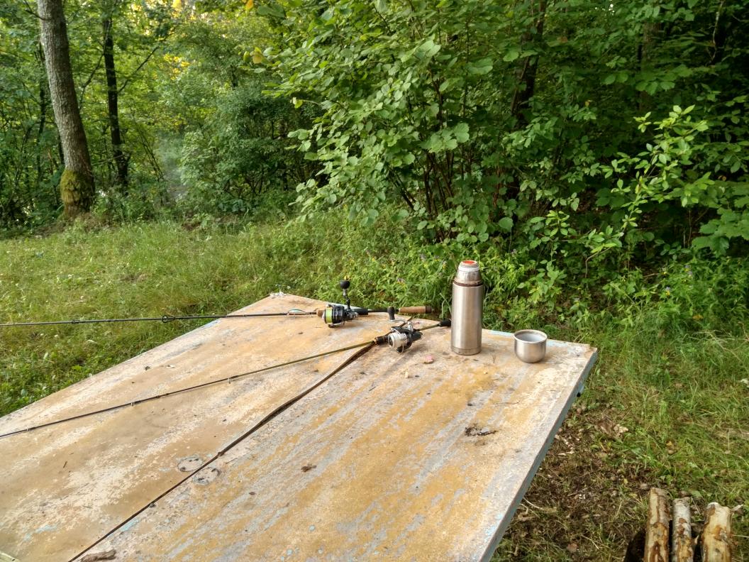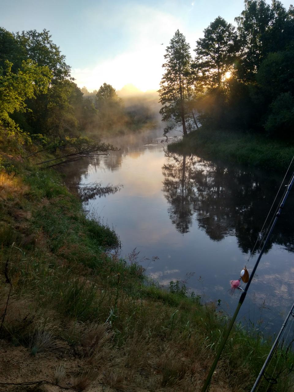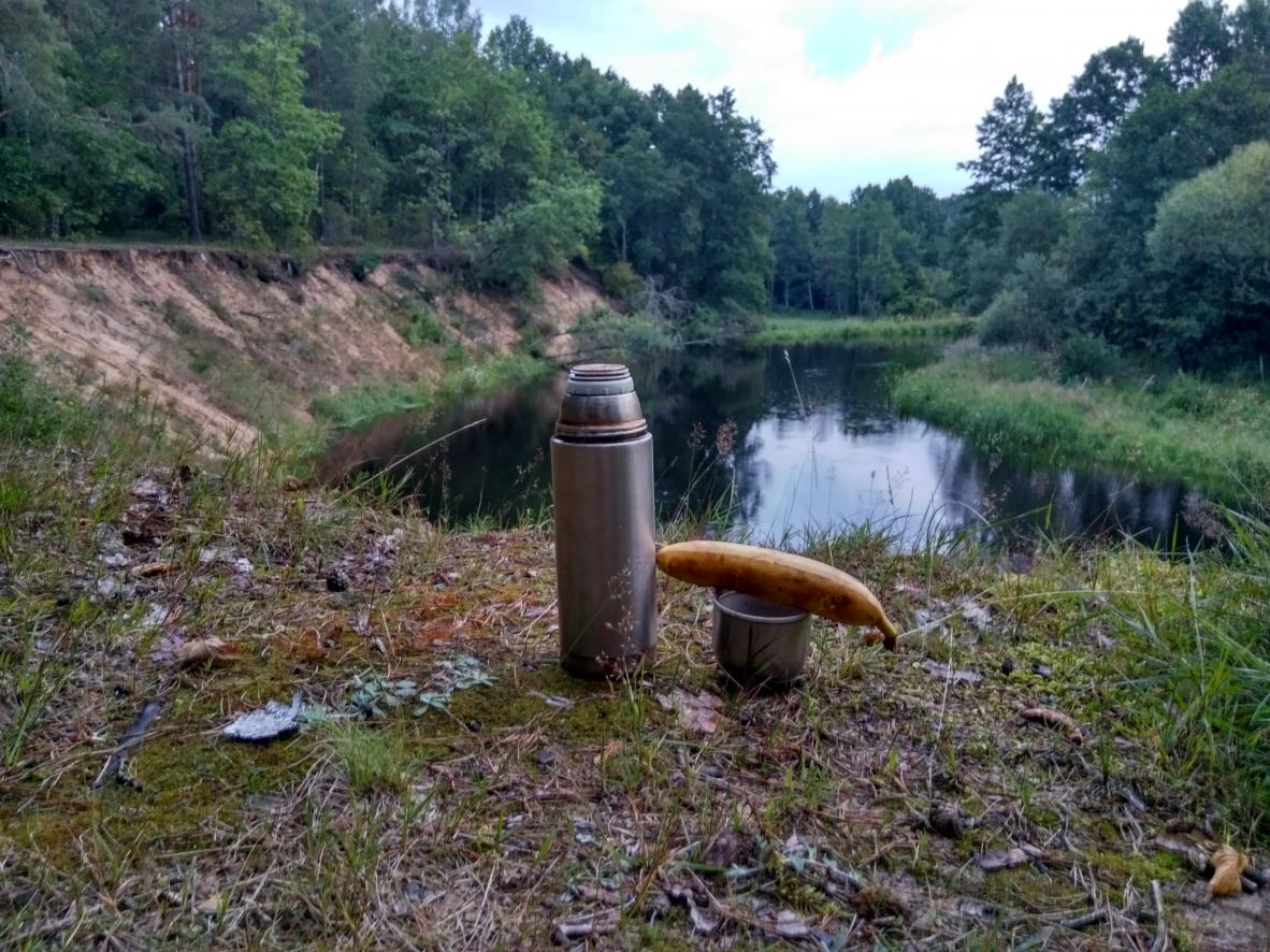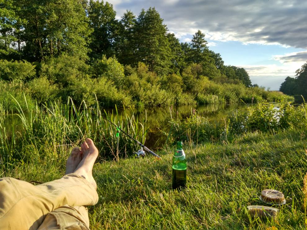 , решили ребёнка навестить, обеспечив ему разнообразие проведения каникулов), он в детском оздоровительном лагере "Теремок", что за Новым Сверженем расположен, сейчас резвится. А Неман то - рядом:D, забрали Саньку с лагеря под свою ответственность по согласованию с воспитателями, и на берег этой живописной речки, с целью - ночёвку там осуществить, выдвинулись. А там, прямо на побережье Немана, организации нейкие сэйшен культурно-спортивно-массовый, с широким размахом и в полный рост, с песнями и плясками, устраивают. По бережку проехали, место нашли без проблем, лагерь свой небольшенький, на бережку, недалече от молодого сосонничка, разбили) Палатка-покрывало-мангал-шашлычок-под пивко, без фанатизма:D Ну и без рыбалки не обошлось. Пока лагерь разбивал, попутно пару кормушек закинул. Очень мелкий в том месте Неман. Поклёвок не случилось. Ближе к вечеру, решив, что хватит спиннинг кашами осквернять, решил использовать его по назначению, кормушку - долой, воблерок присобачил, Саньку в сопровождающие прихватил, и вниз по течению по речке дотемна прогулялись