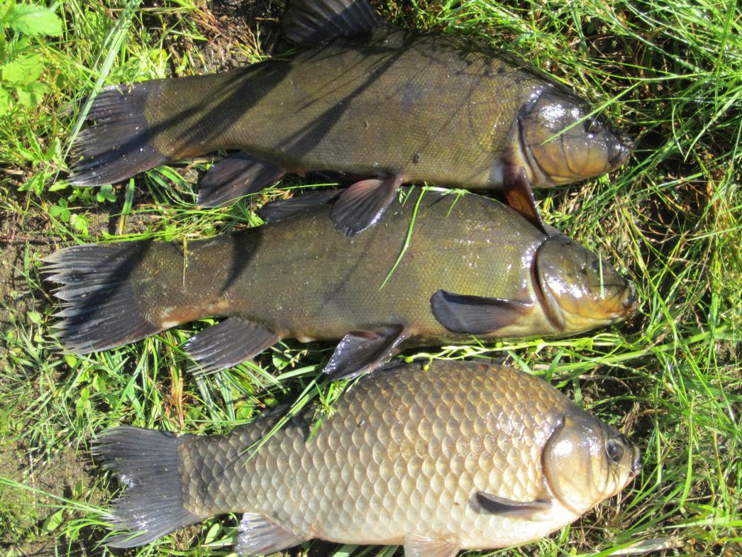 Карась и линь успешно перезимовали и набрали вес. Кормовая база для них очень хорошая. Окунь есть, но мелкий ему ещё необходимо пару лет откормиться. Много малька (плотвы-краснопёрки), видимо нерест прошёл удачно. Есть и неплохая плотвичка и краснопёрка.