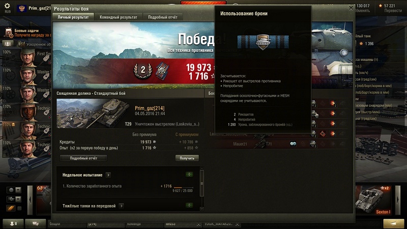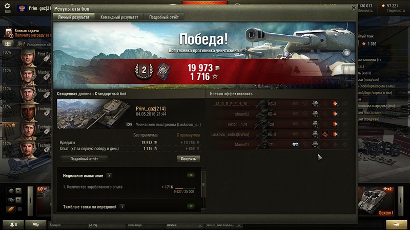 да тупанул, не сделал скрин результата. но есть урон от ИС-4, заблокированный, 1280 единиц. получается от тяжей хде-то 5-6 тыщ, примерно. но лупили по мне зачетно, а обойти побаивались, яга выносила на раз)Сообщение от volodya Посмотреть сообщениеПримус, то что Т29 может впитать кучу потенциалки в лоб, я знаю не по наслышке, вопрос сколько тебе влетело?? Не видно из скрина))