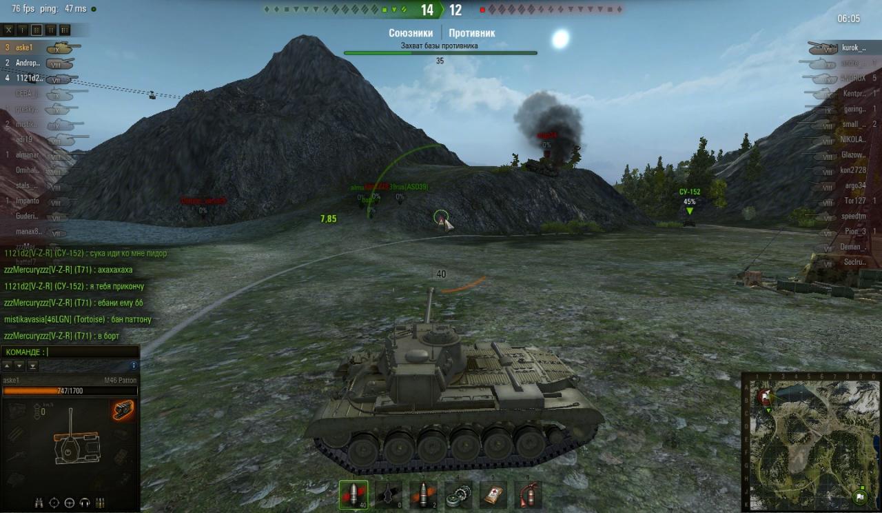 типа пушка у паттона 0.42 косая? Сомневаюсь, стабилизация божественная! Попасть на ходу по едущему лт-пожалуйста! Попасть без сведения за 200 метров-пожалуйста! Накинуть с вертухи без сведения-пожалуйста! Офигенный танк!