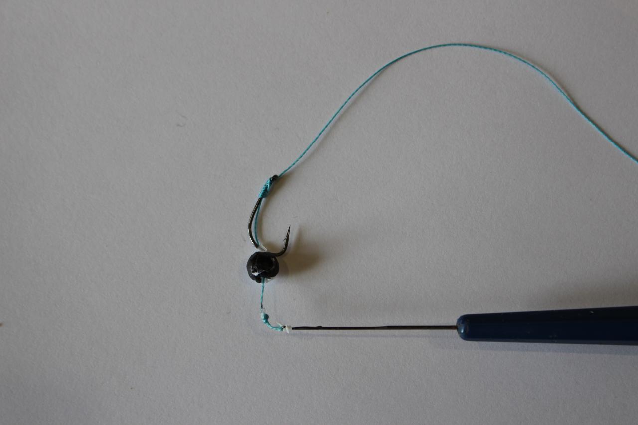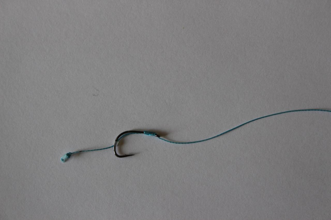 На плетенку одеваю небольшой кусочек силиконового кембрика в который продеваю жало крючка и вяжу безузловой узел. С другой стороны поводка вяжу петельку для крепления поводка.