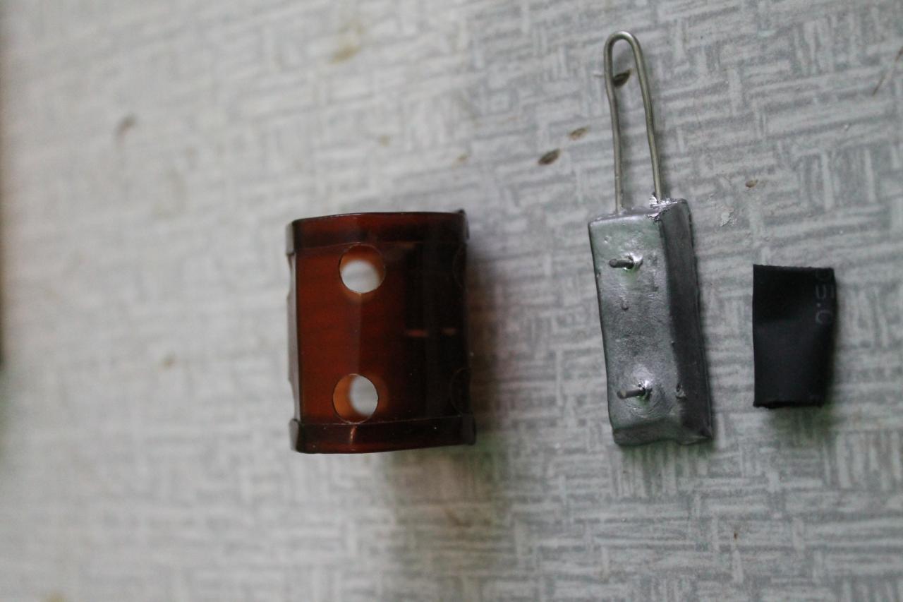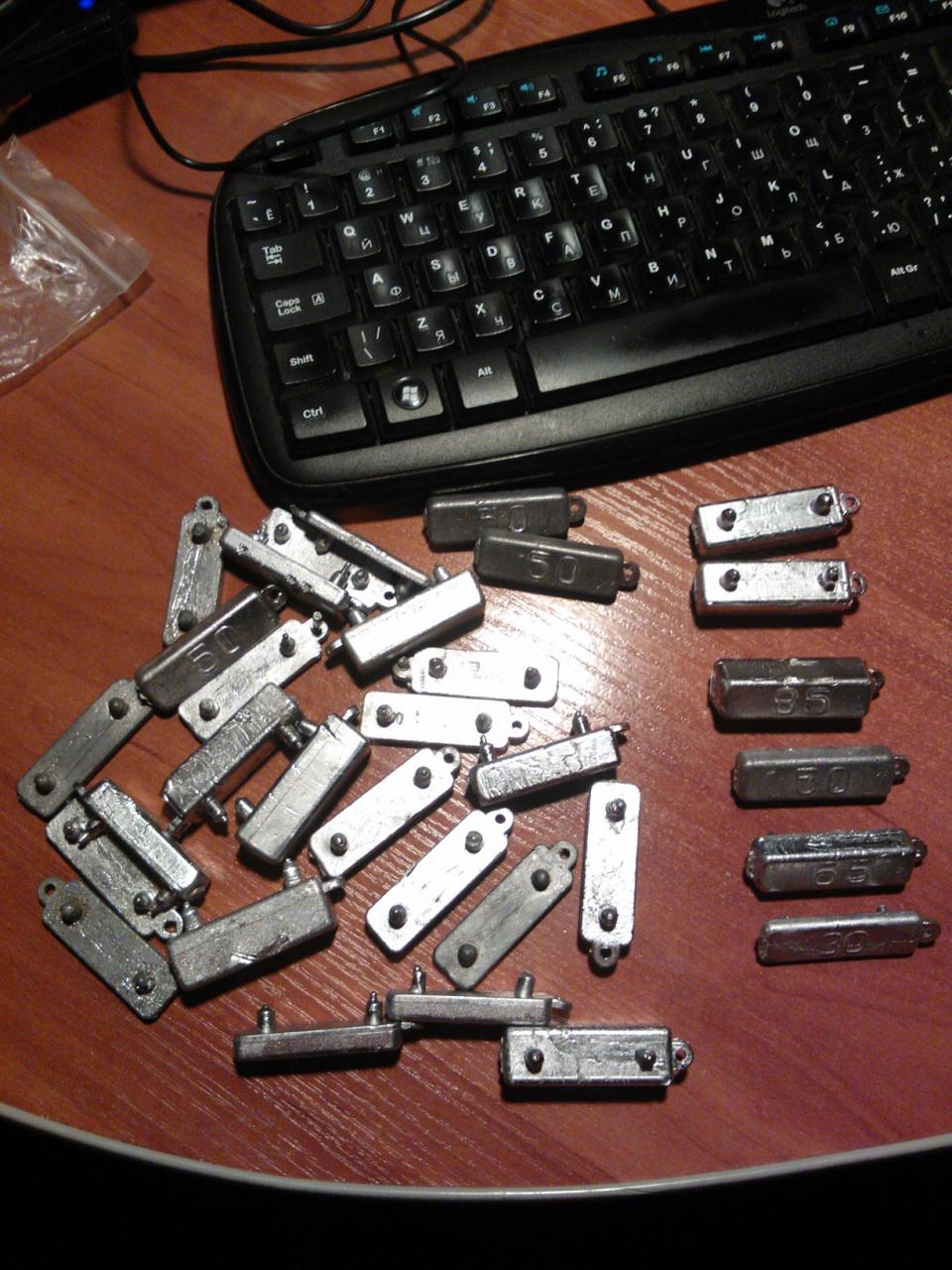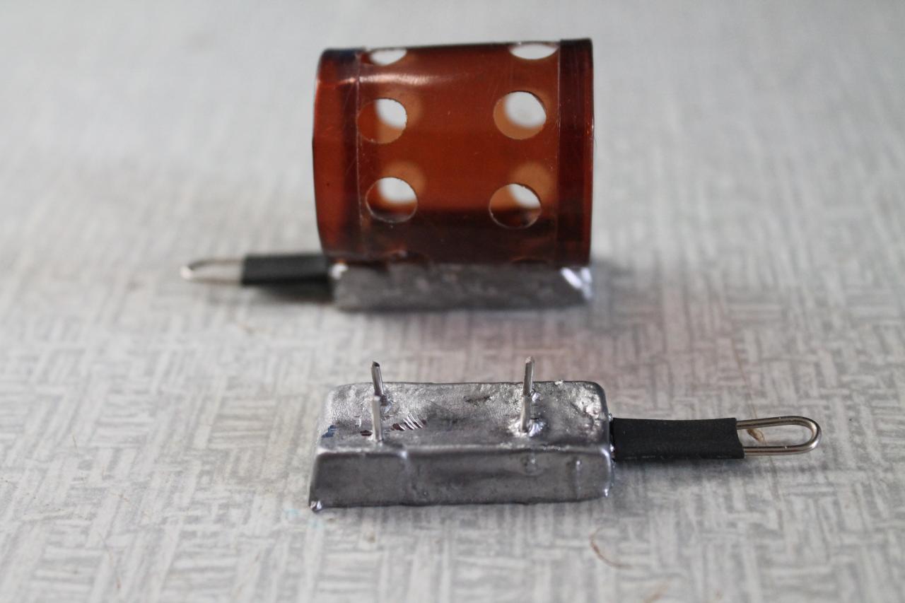 Отверстия сделаны паяльником. Поводок тоже из пластики. Все скреплено паяльником. Степлером только для начала. Грузы прямоугольные с отверстиями. Креплю клепочником, практически, перед рыбалками. Можно саморезами. В зависимости от уровня воды на реке, крепил разные грузы. Груза льются простейшие в виде параллелепипеда. Можно в ямки в гипсе. Очень быстро, в отличие от металлических форм. Себестоимость тела кормушки = 0 (свое время ради хобби только в плюс :) ). Груз крепится любой с одной ровной стороной. Для озера крепится обычная свинцовая пломба. Грамм 15-20 она весит.
