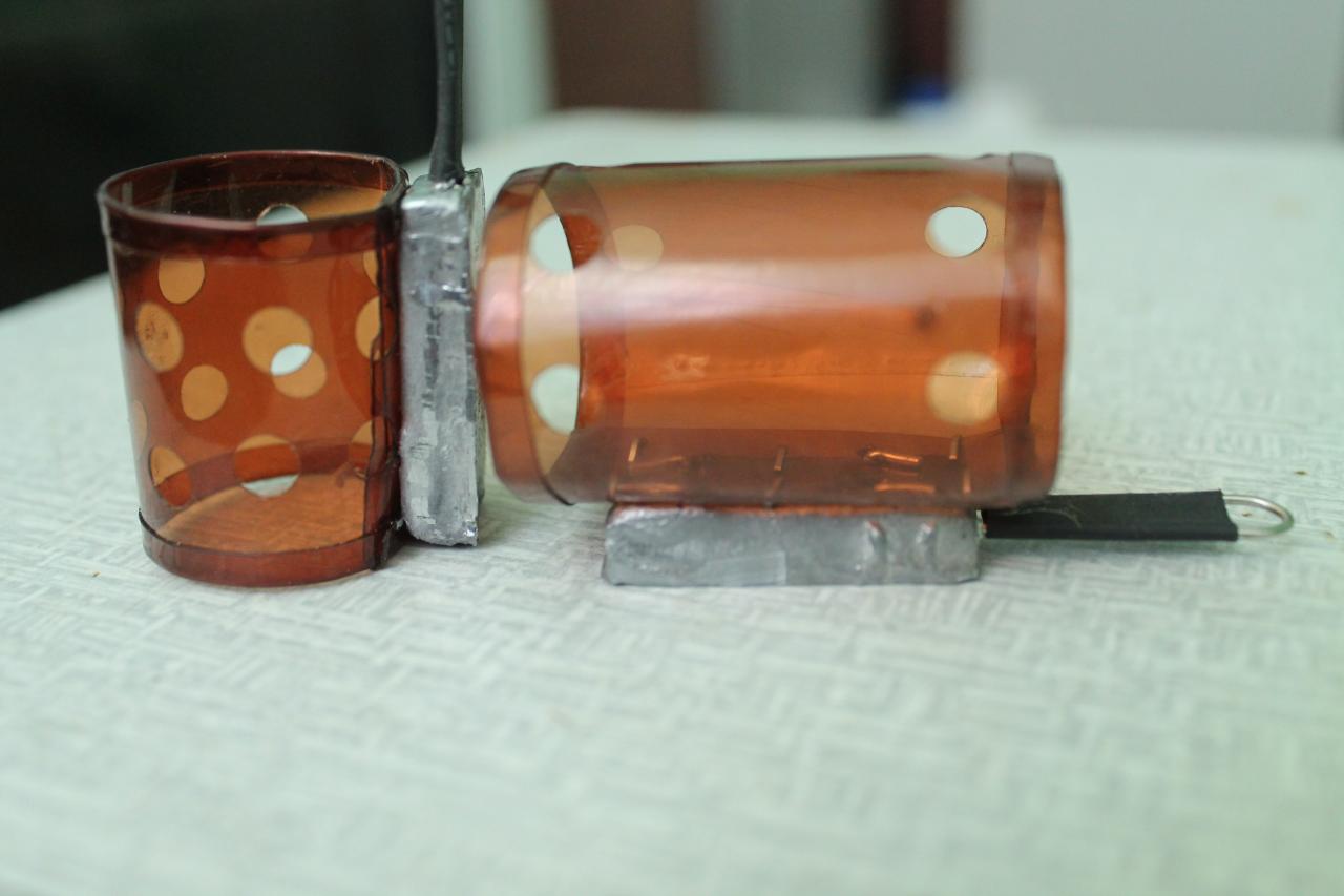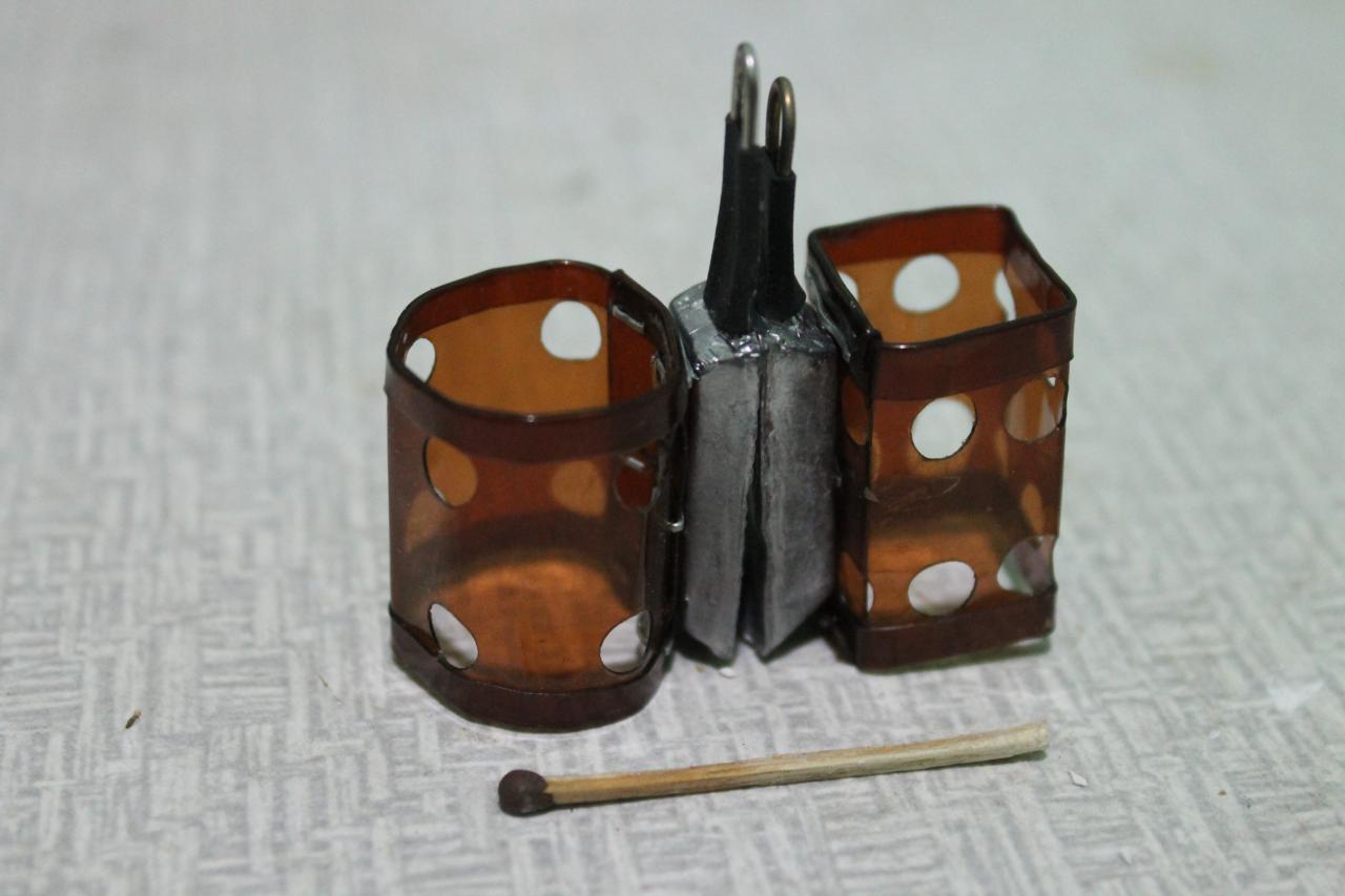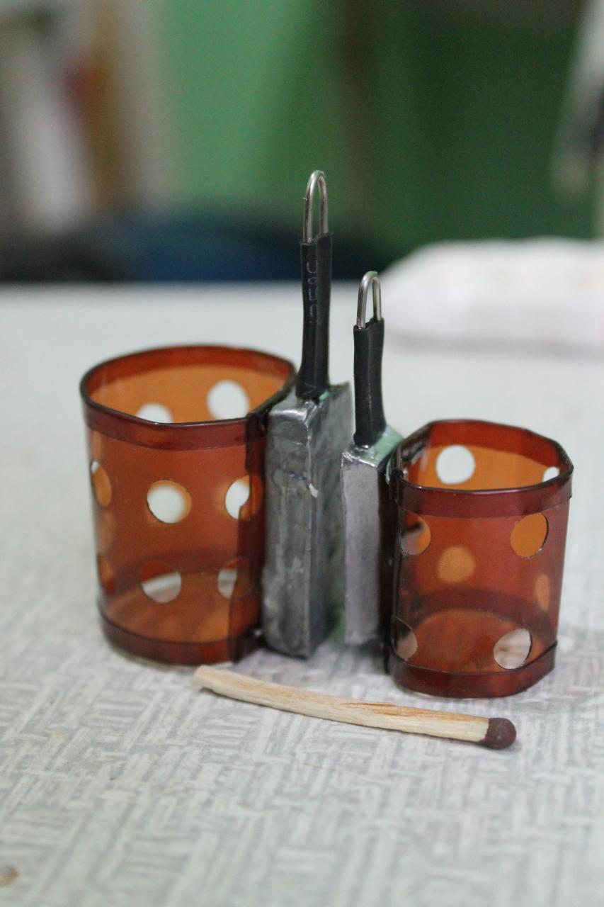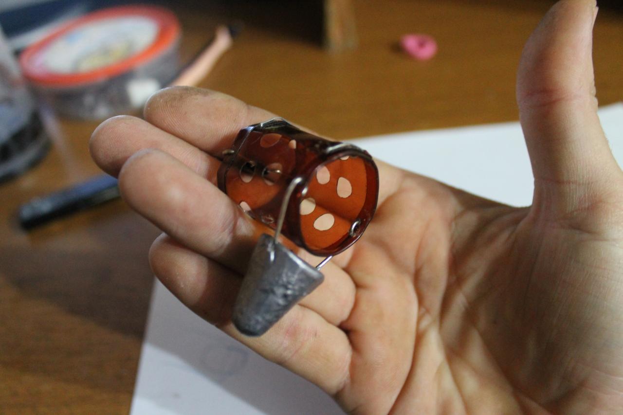 Отверстия сделаны паяльником. Поводок тоже из пластики. Все скреплено паяльником. Степлером только для начала. Грузы прямоугольные с отверстиями. Креплю клепочником, практически, перед рыбалками. Можно саморезами. В зависимости от уровня воды на реке, крепил разные грузы. Груза льются простейшие в виде параллелепипеда. Можно в ямки в гипсе. Очень быстро, в отличие от металлических форм. Себестоимость тела кормушки = 0 (свое время ради хобби только в плюс :) ). Груз крепится любой с одной ровной стороной. Для озера крепится обычная свинцовая пломба. Грамм 15-20 она весит.