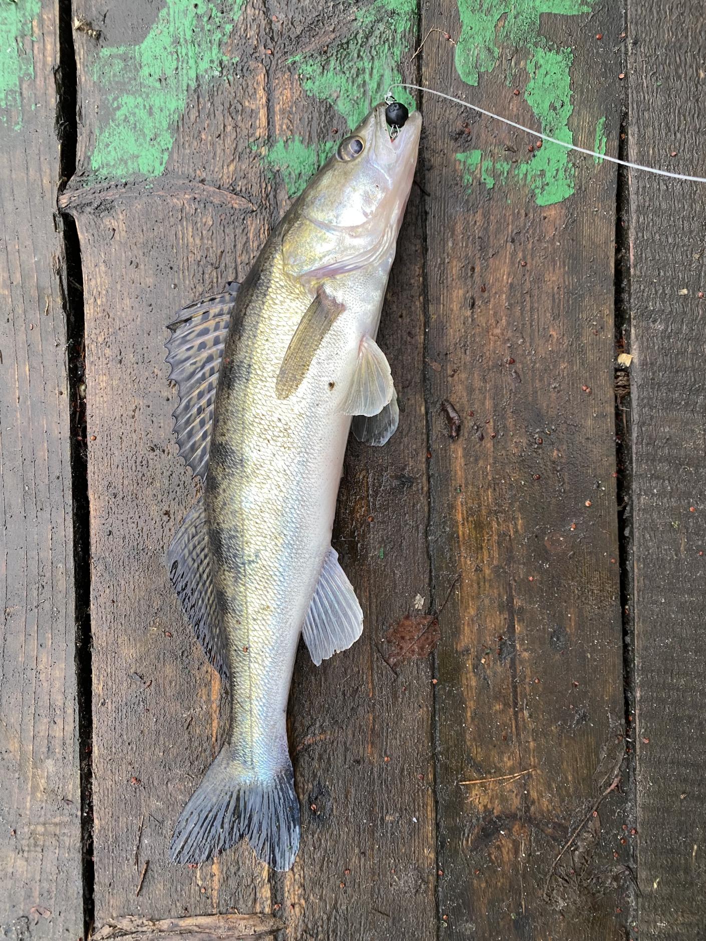 • Осиповичское водохранилище приготовило в этот день для меня несколько хороших сюрпризов. Во-первых поклевки мелкого судака были с самого начала рыбалки, далее со временем размер увеличивался. Было много холостых поклевок, а также много сходов судака. Во-вторых после нескольких срезов поводка клюнула неплохая щука на Keitech Swing Impact Fat 2.8" Mystic Spice, еще через минут 10 уже на Reins Bubbring Shad 4" Green Pumping взяла щука чуть потяжелее первой. Решил упереться в Rains т.к. были на него еще поклевки мелкого судачка. Как итог резкий стук в руку и на том конце плетенки чувствую что-то очень хорошее! Судак на 3850!