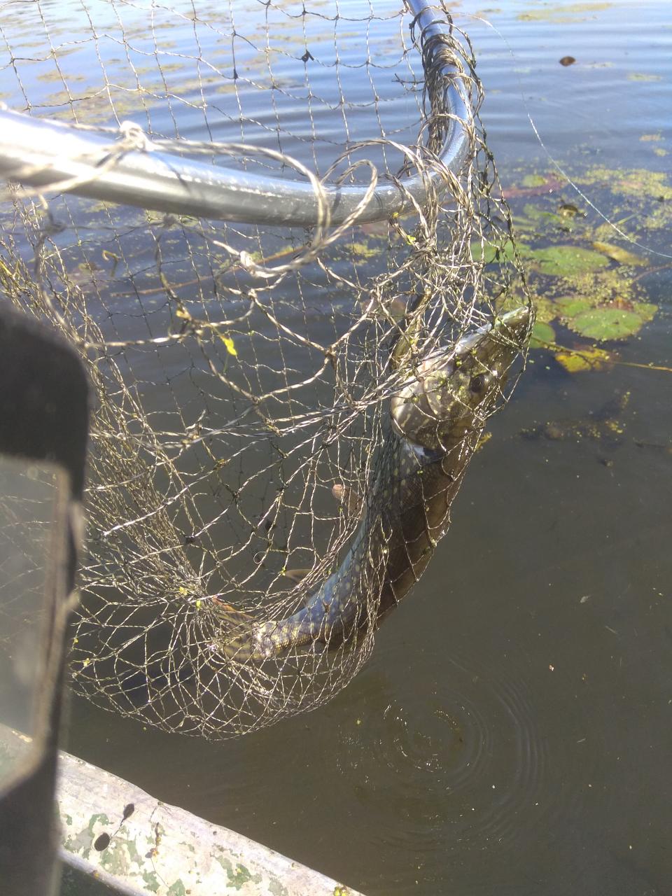 небольшой и пока не зачётной щучкой . Немногоо покидал на открытом, а как солнце поднялось и стало светить на воду- снова поближе к ковру из ряски сместился. Но и этого оказалось недостаточно для результата, вторая почтившая меня своей поклёвкой, вполне зачётная щука клюнула в месте где приличную площадь воды закрывает тень от деревьев.