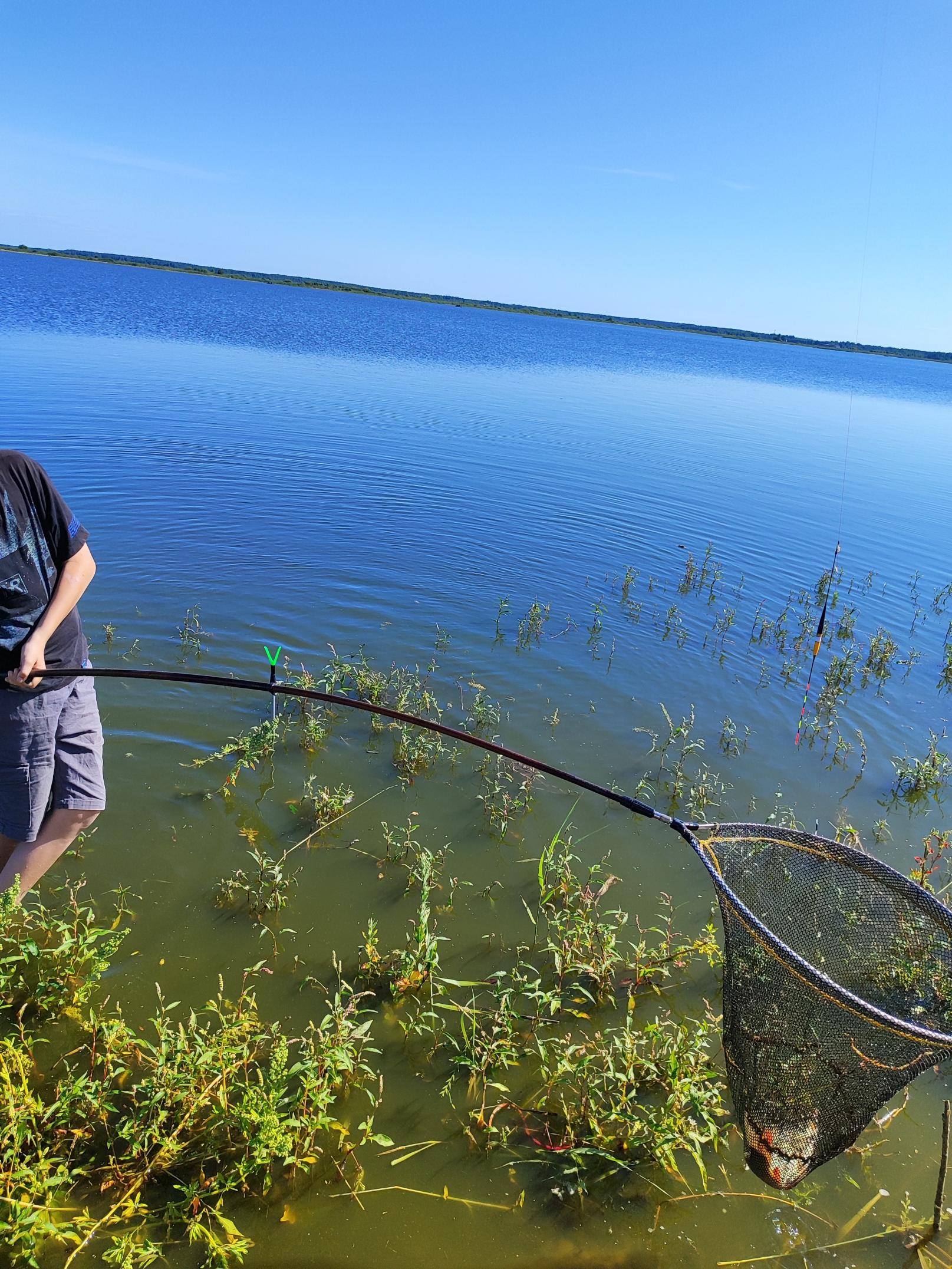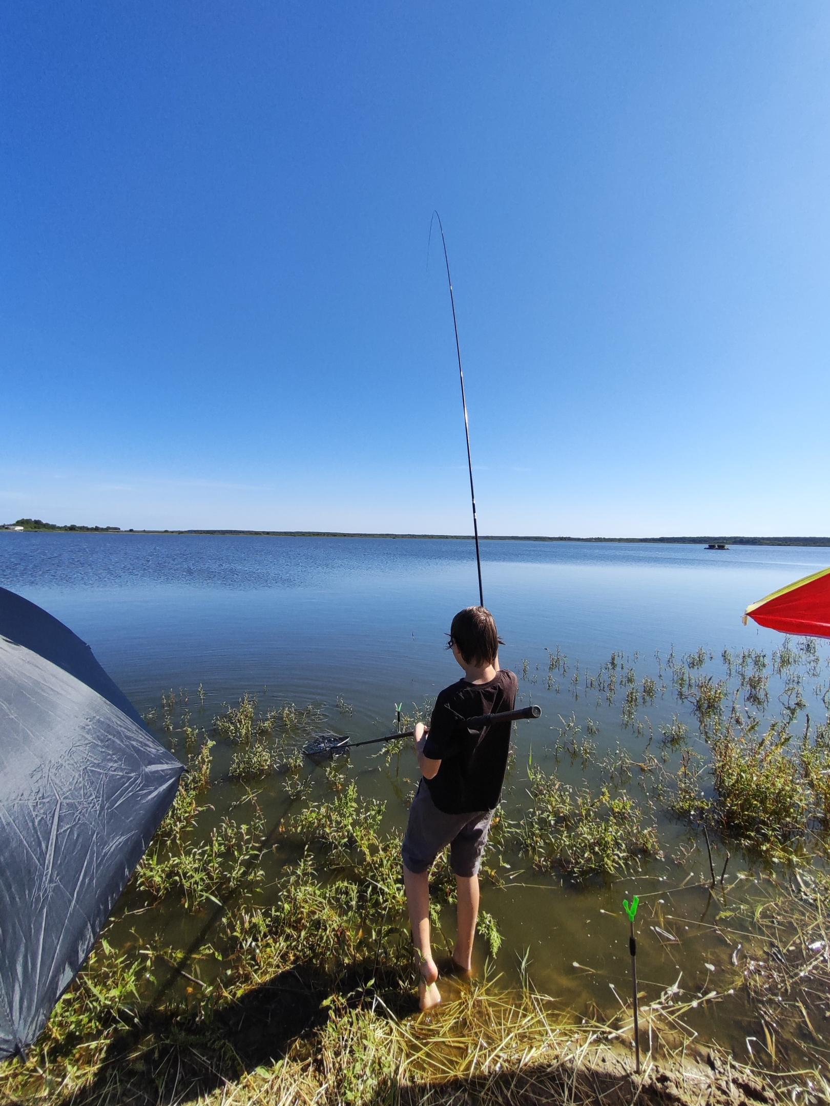 Клевать начало с первого заброса. Поймать пацан сразу не смог, но я ему сказал понаблюдать и подумать когда подсекать. В общем, не успел я разложить свою удочку, как уже тянет. Ну на тебе подсак, разбирайся со своей рыбой)