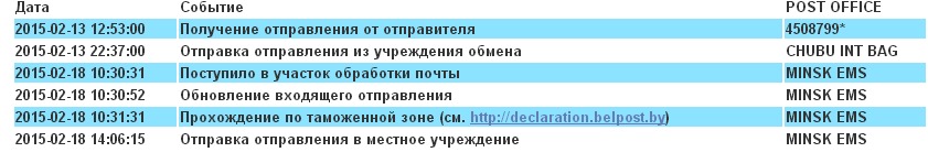 2015-02-11 17:24:46 Поступило в участок обработки почты MINSK PI 2