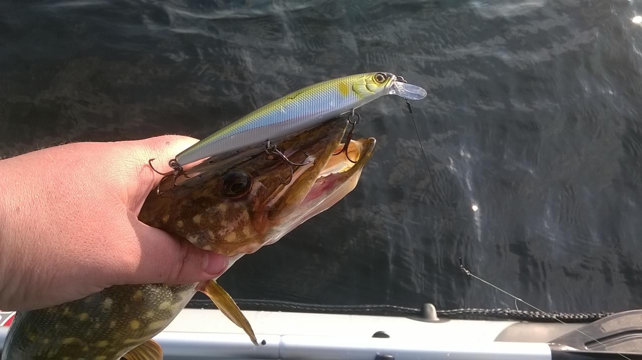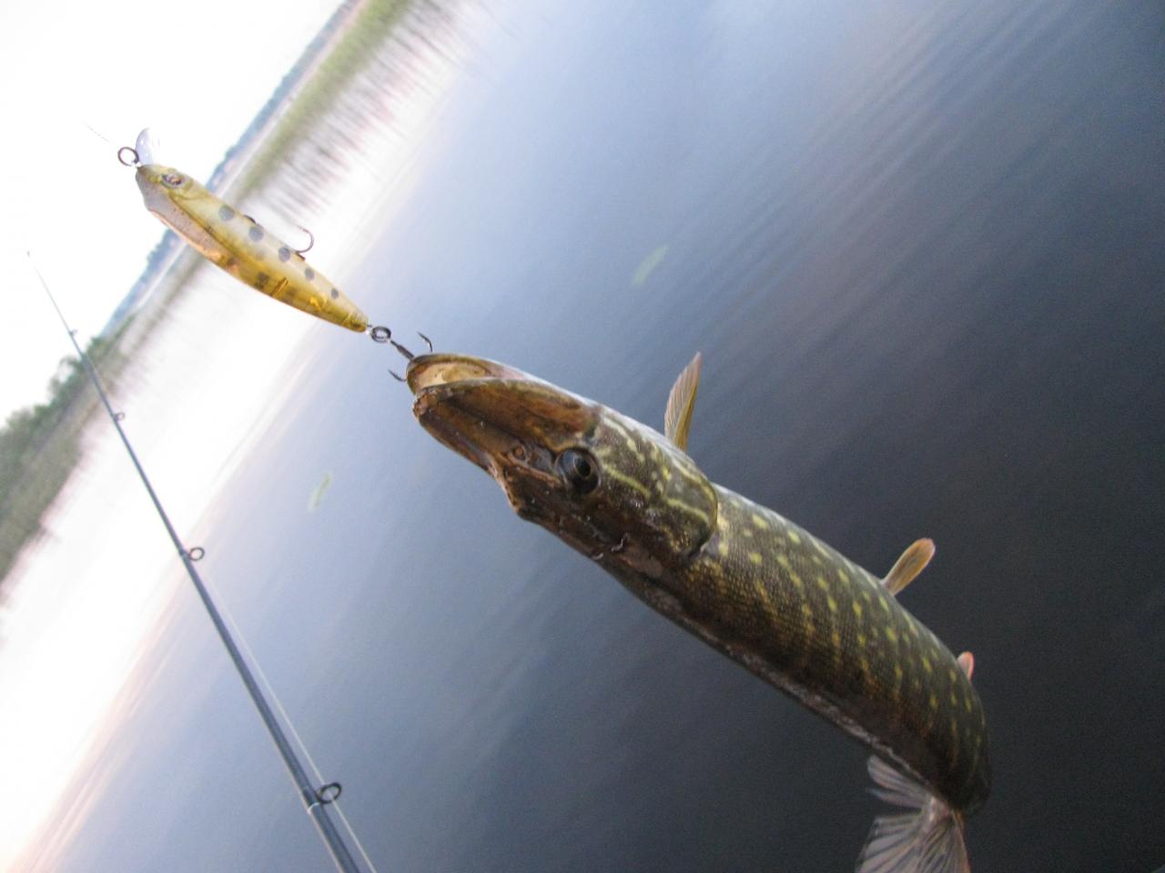 Еще раз вышли уже ближе к 8-30, по-моему. У брата отзывалась щук на твич. Вертушки в поисках окуня и щуки молчали, не говоря о резине. Выловил только одну, после ее двух тычков. Переключился тоже на воблеры. Было похоже что нарвались на выход. Килошная щука влетала вперемешку с недоросшими до промысловой меры. Притом большинство стояло ближе и в траве, но с бровки тоже "заходила". Воблеры все были порядка 9-11см, примерно 1,5-2м заглубления, суспендеры, цвет под натурал, 3д и прозрачный - вода поражала прозрачностью, несмотря на ветер и волну!