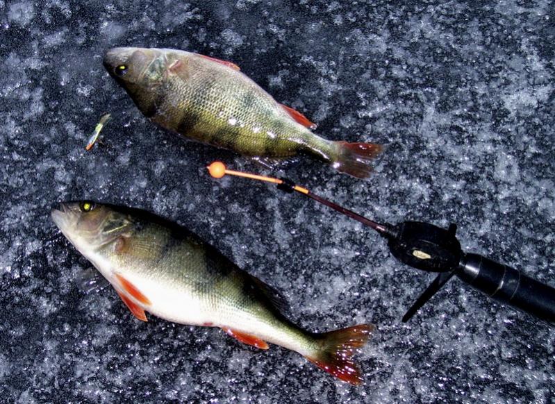 28.12.2009г. 06:45. На лед вышли затемно, жерлицы расставляли в полной темноте. Погода отличная – слабый морозик, несильный ветер – настрой отличный! Живец: карась («золотой» по стоимости, а по ихтиологической классификации - «серебряный»:), местный окунь, плотвичка). Вскоре, с рассветом, началось…Началось то, за что многие из нас и любят такой вид зимней ловли, как жерлицы - при наличии клева трудно найти более активный, я бы сказал «легкоатлетичный» вид ловли… Засиживаться щука не давала, особенно контролирующим жерлицы, установленные на плато на выходе из ямы. За день ребята побегали хорошо, вот часть улова, которую удалось доставить на лед + окунь изловленный мной на балансир и переданный для использования в качестве наживки на «Большую Рыбу», но товарищи по прямому назначению использовать его так и не решились…